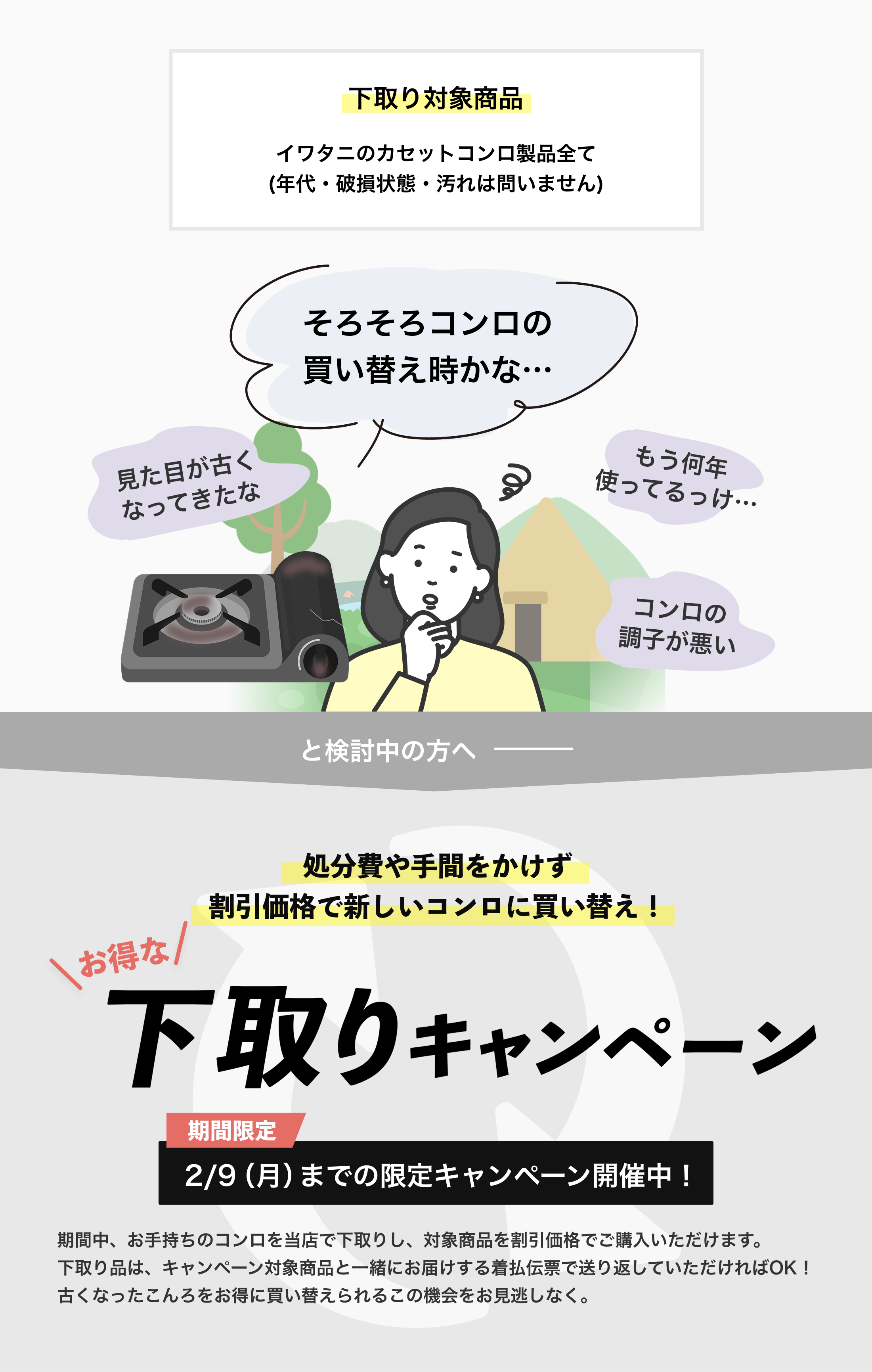 キャンペーン期間:2025/11/12(水)~2026/02/09(月)古くなったイワタニのカセットこんろ製品をイワタニアイコレクトで下取りし、対象商品を最大15%OFFでご購入いただけます。