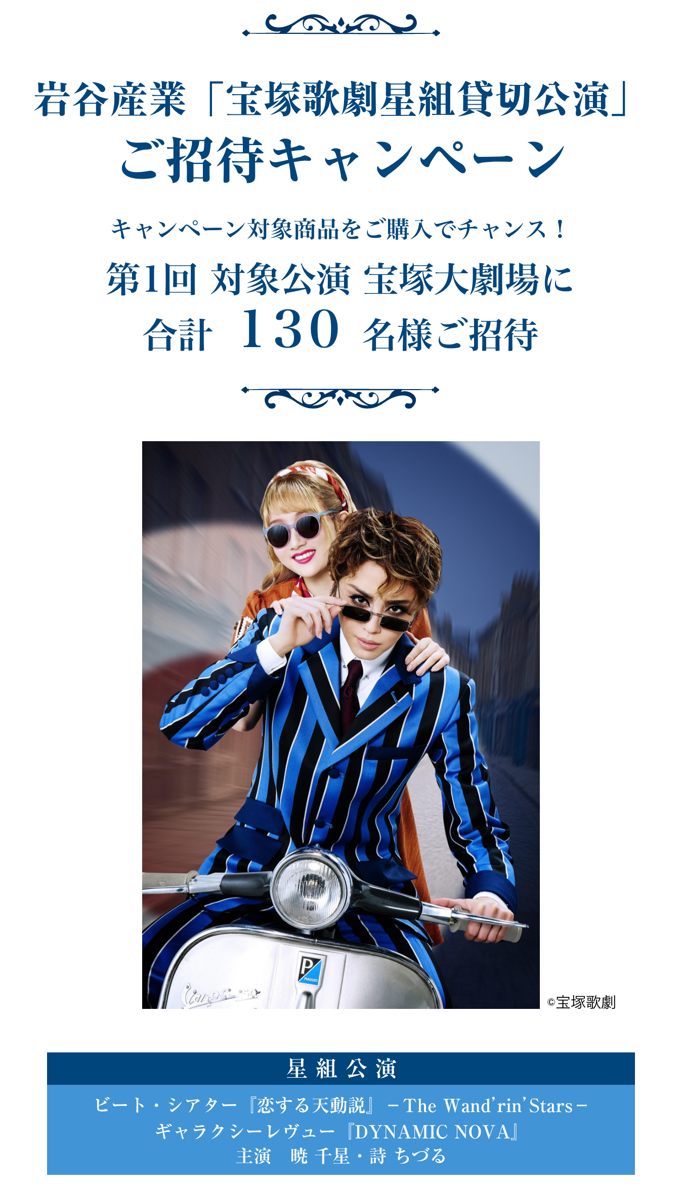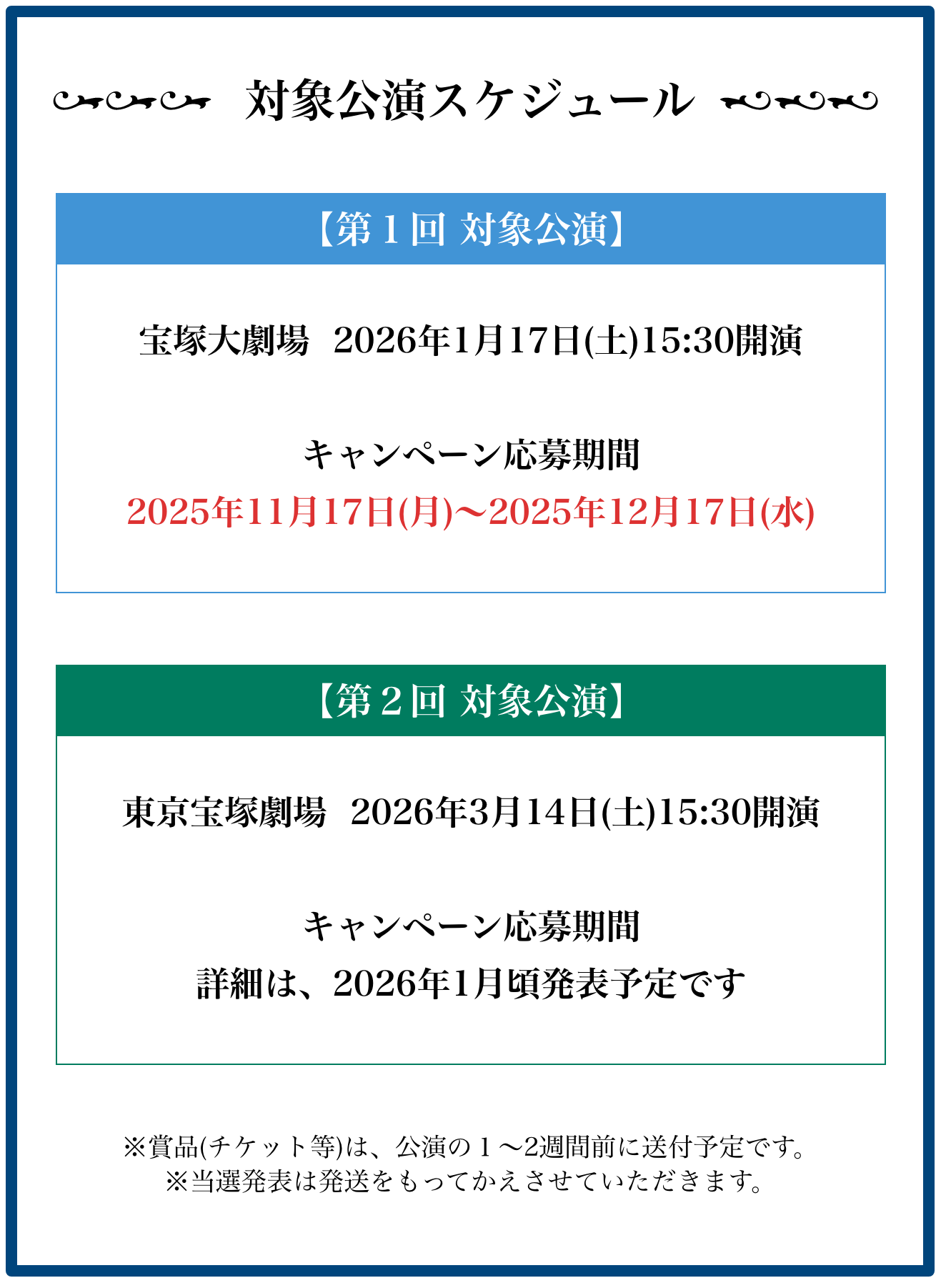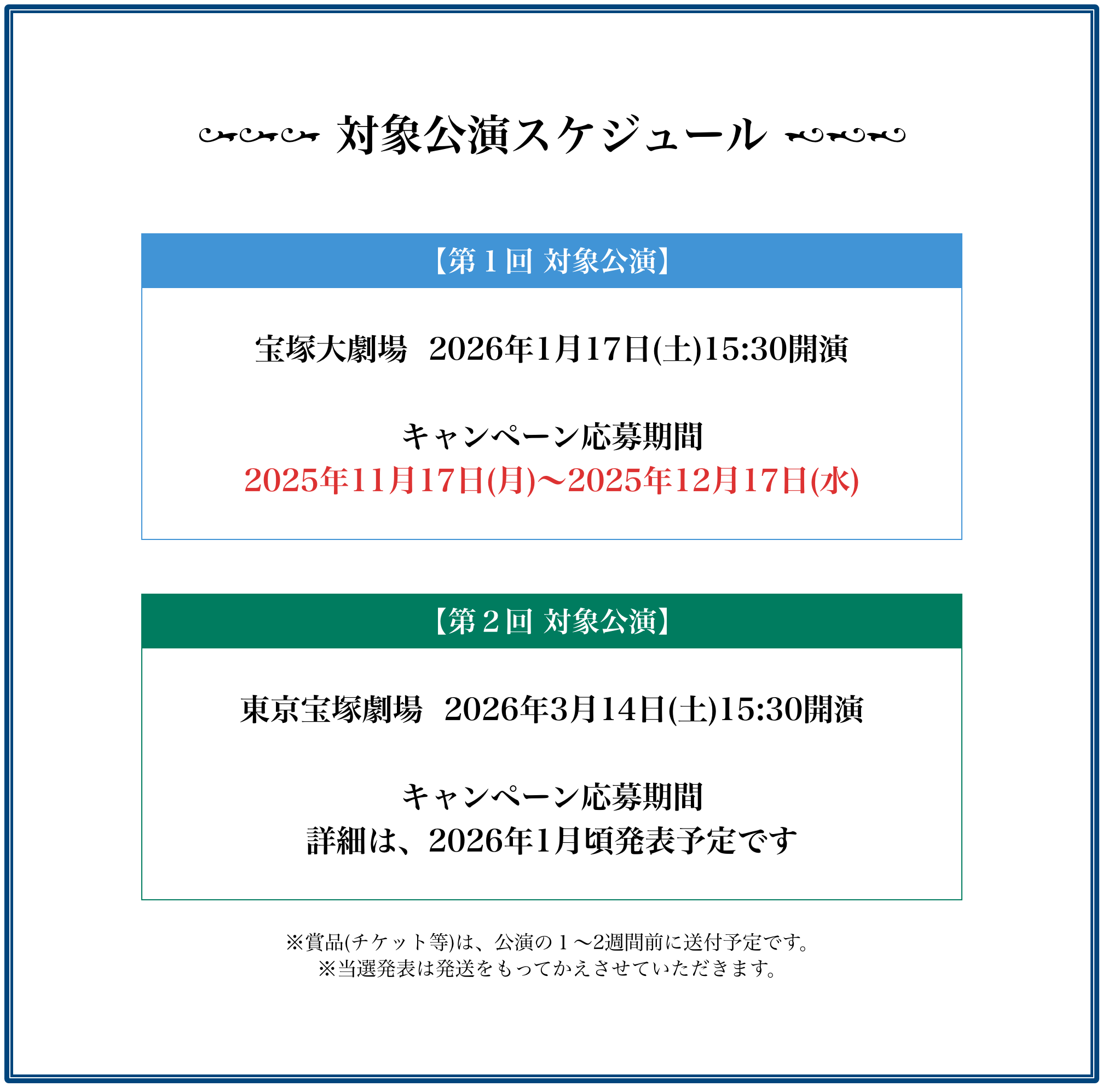 - ・賞品:宝塚歌劇 貸切公演 2026年1月17日(土)星組公演(会場:宝塚大劇場/開場 15:00~開演 15:30)