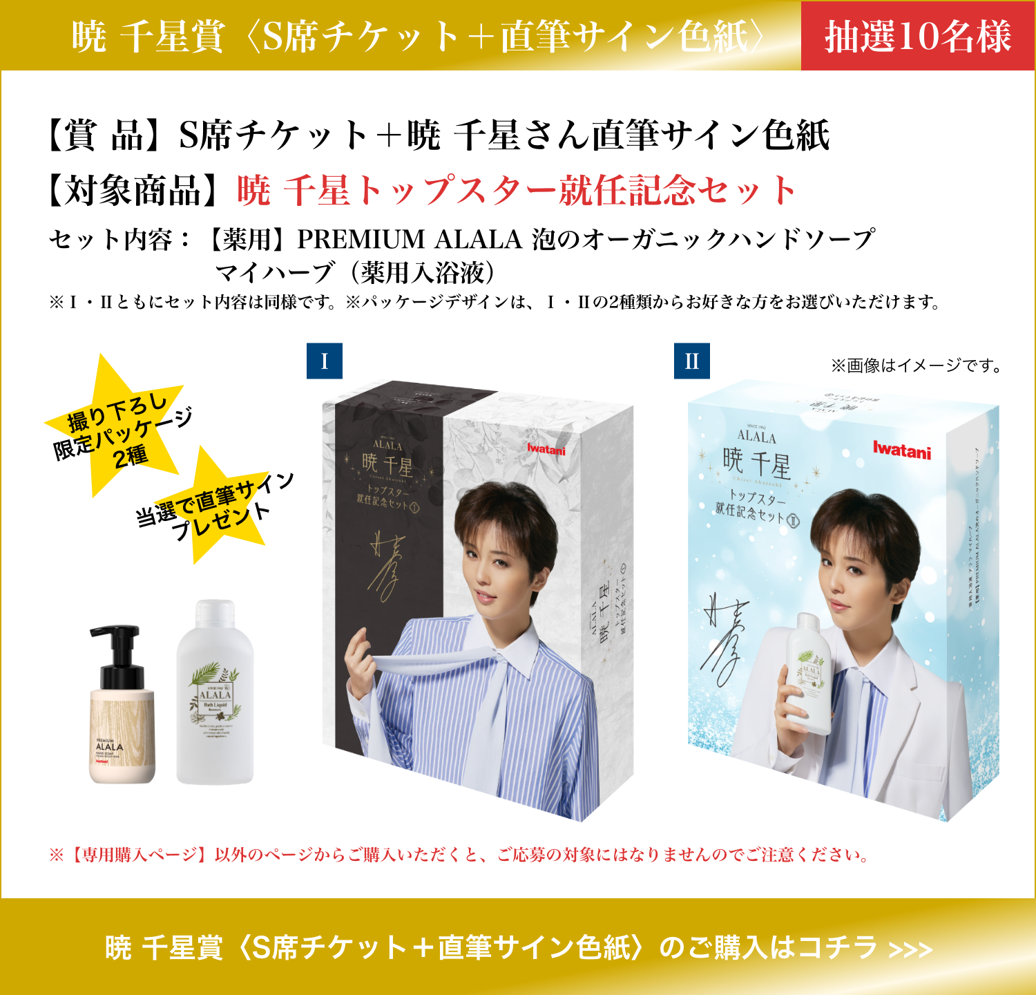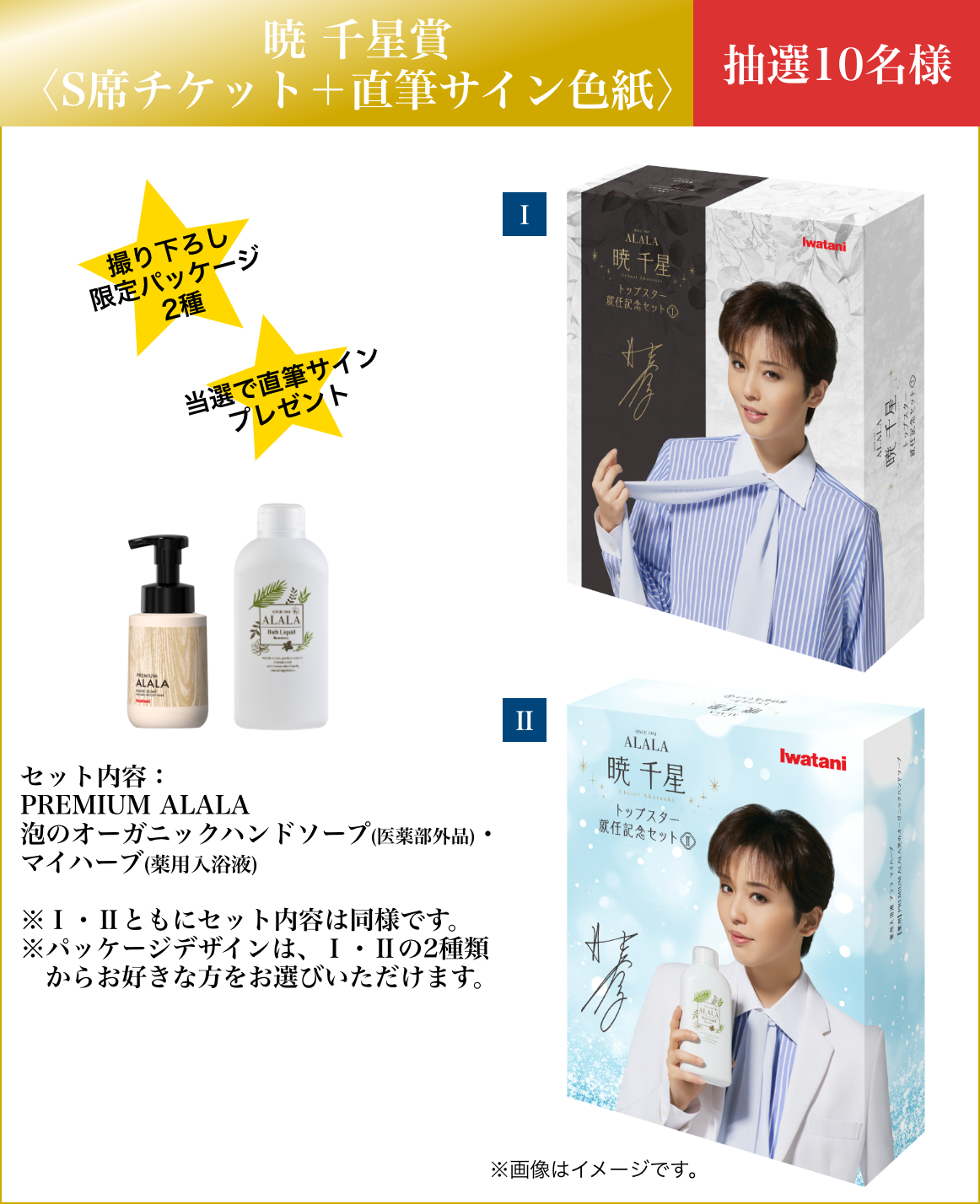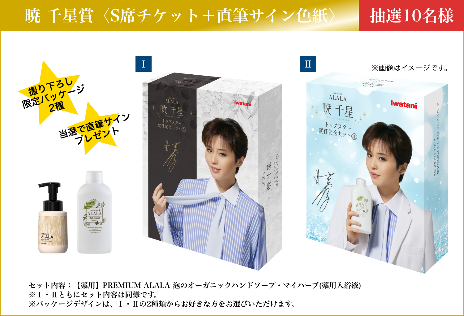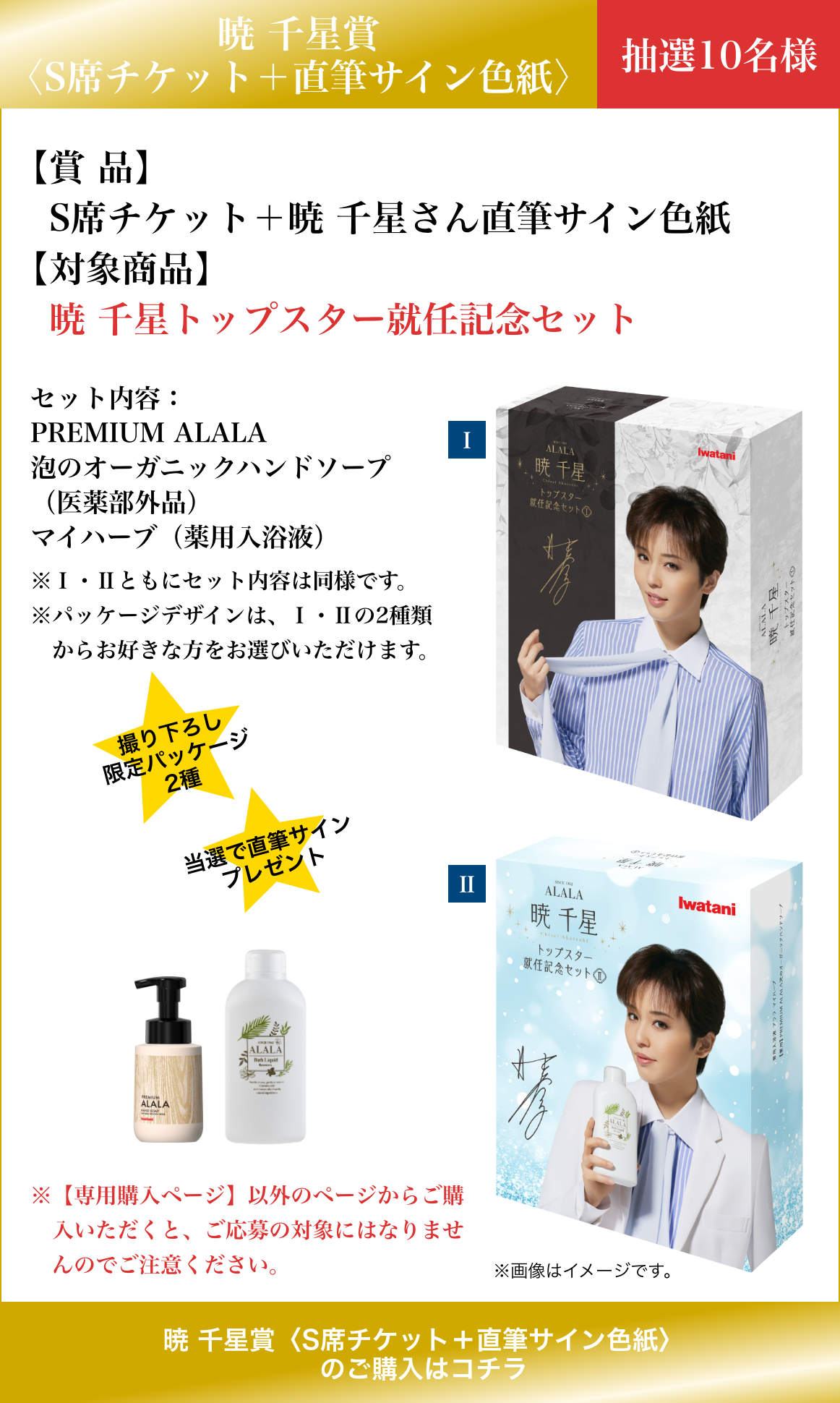 ・暁 千星賞(抽選)対象:「暁 千星 トップスター就任記念セット」(「【薬用】PREMIUM ALALA 泡のオーガニックハンドソープ」と「マイハーブ(薬用入浴液)」のセット。パッケージデザインはⅠ・Ⅱの2種類からお好きな方をお選びいただけます。)