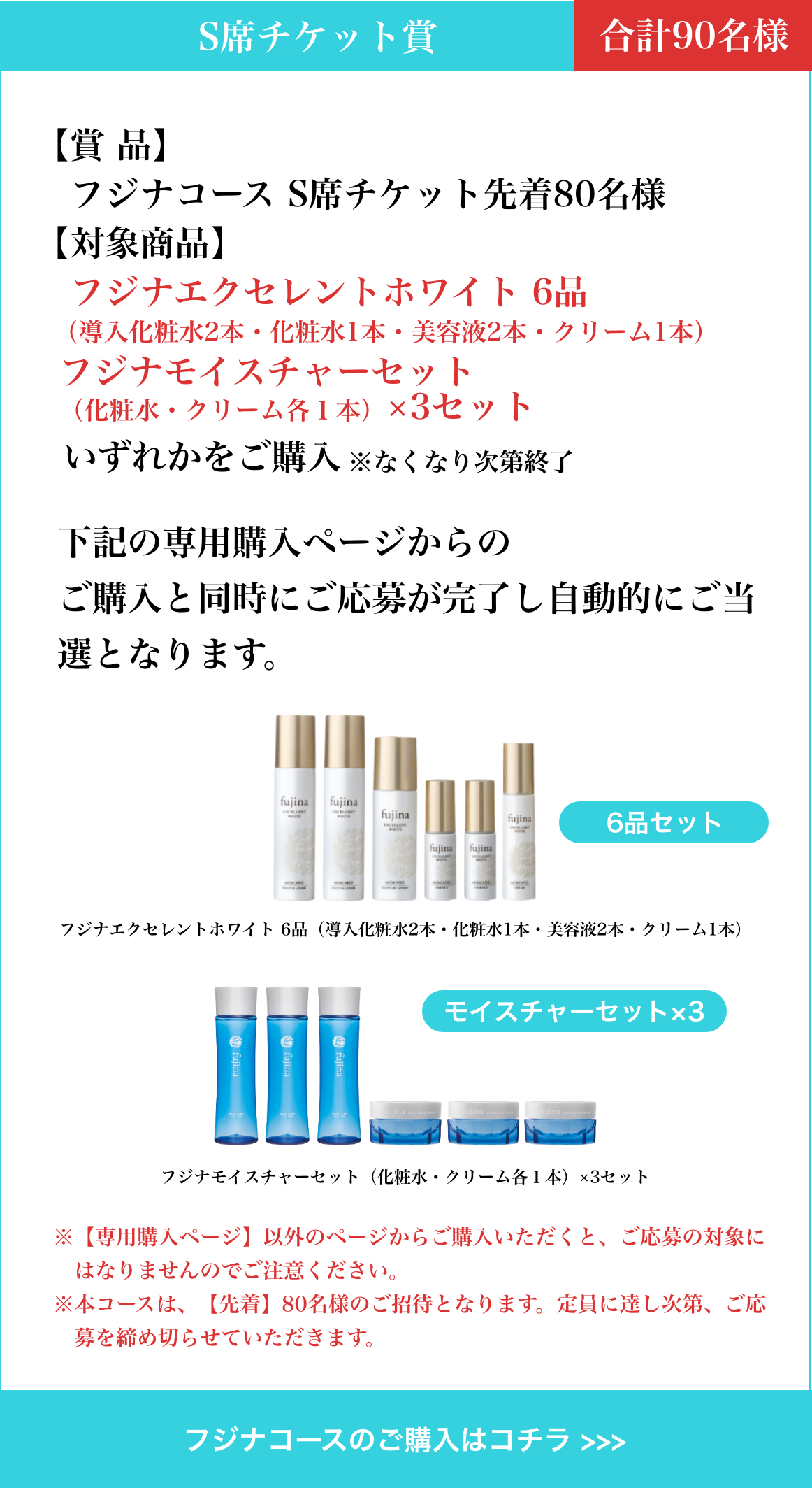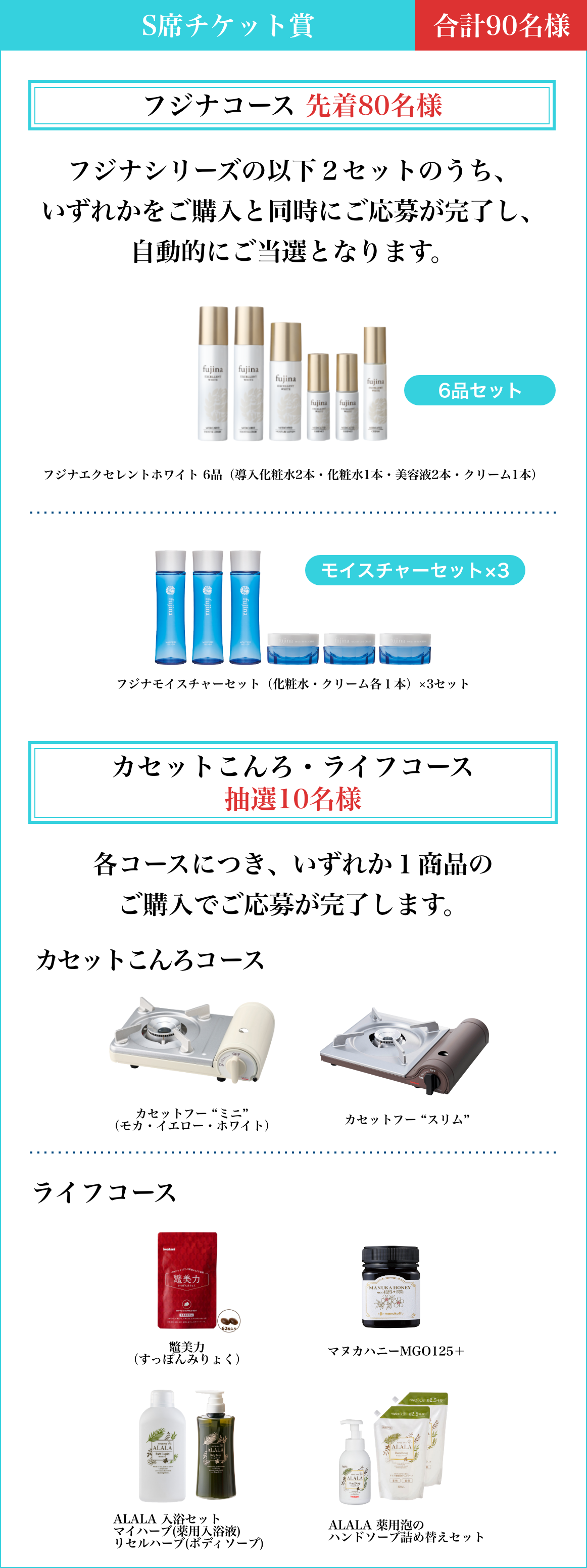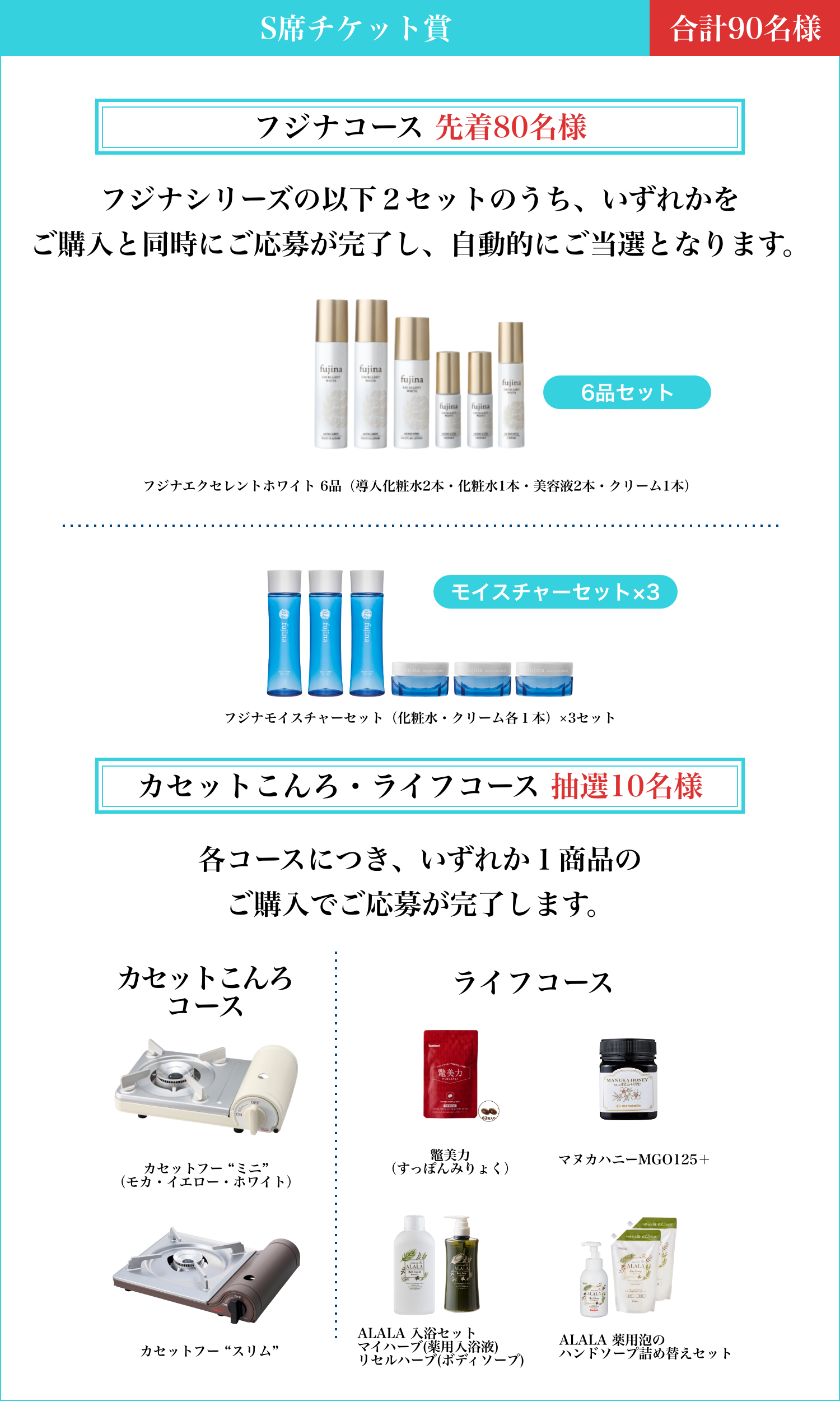 S席チケット賞 フジナコース(先着)およびA席チケット賞(先着)は、対象商品1セットのご購入で1席分のご応募(当選)となります。それぞれ先着枠(S席:80名様、A席:30名様)に達し次第、受付を終了します。