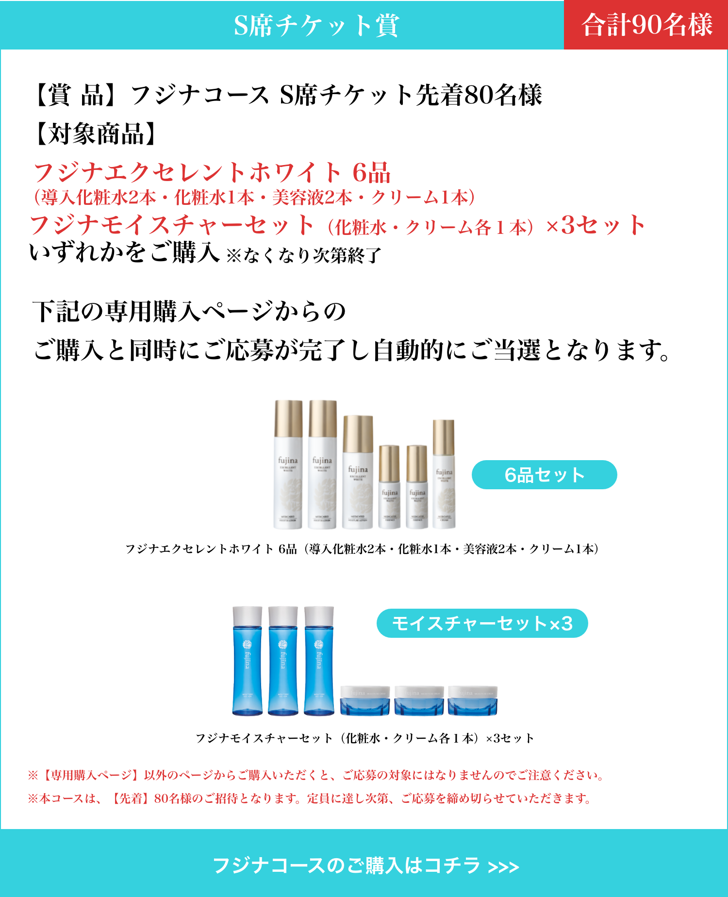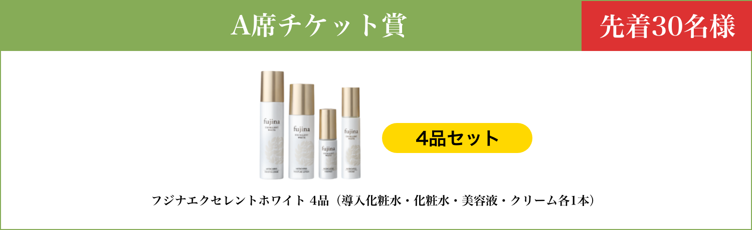 ・A席チケット賞(先着)対象:「フジナエクセレントホワイト 4品」(導入化粧水・化粧水・美容液・クリーム 各1本)