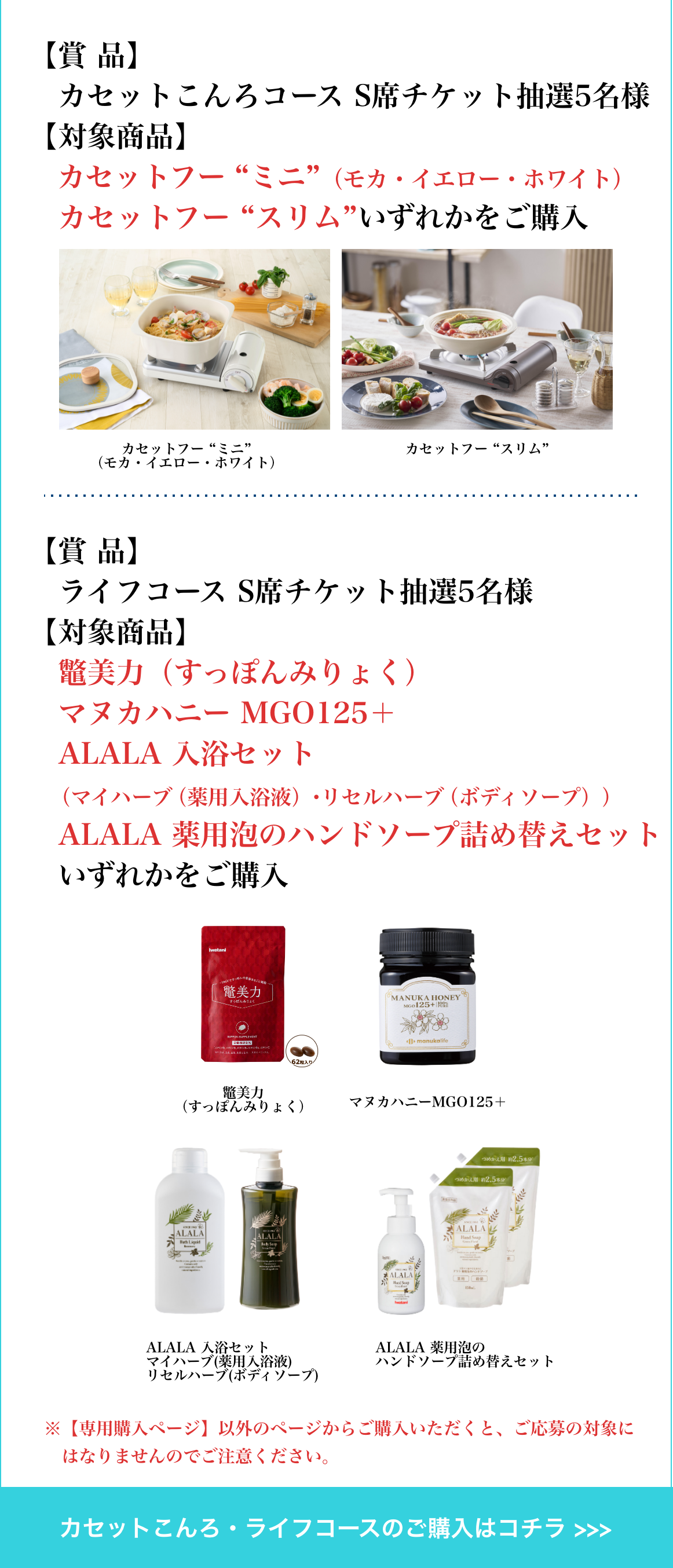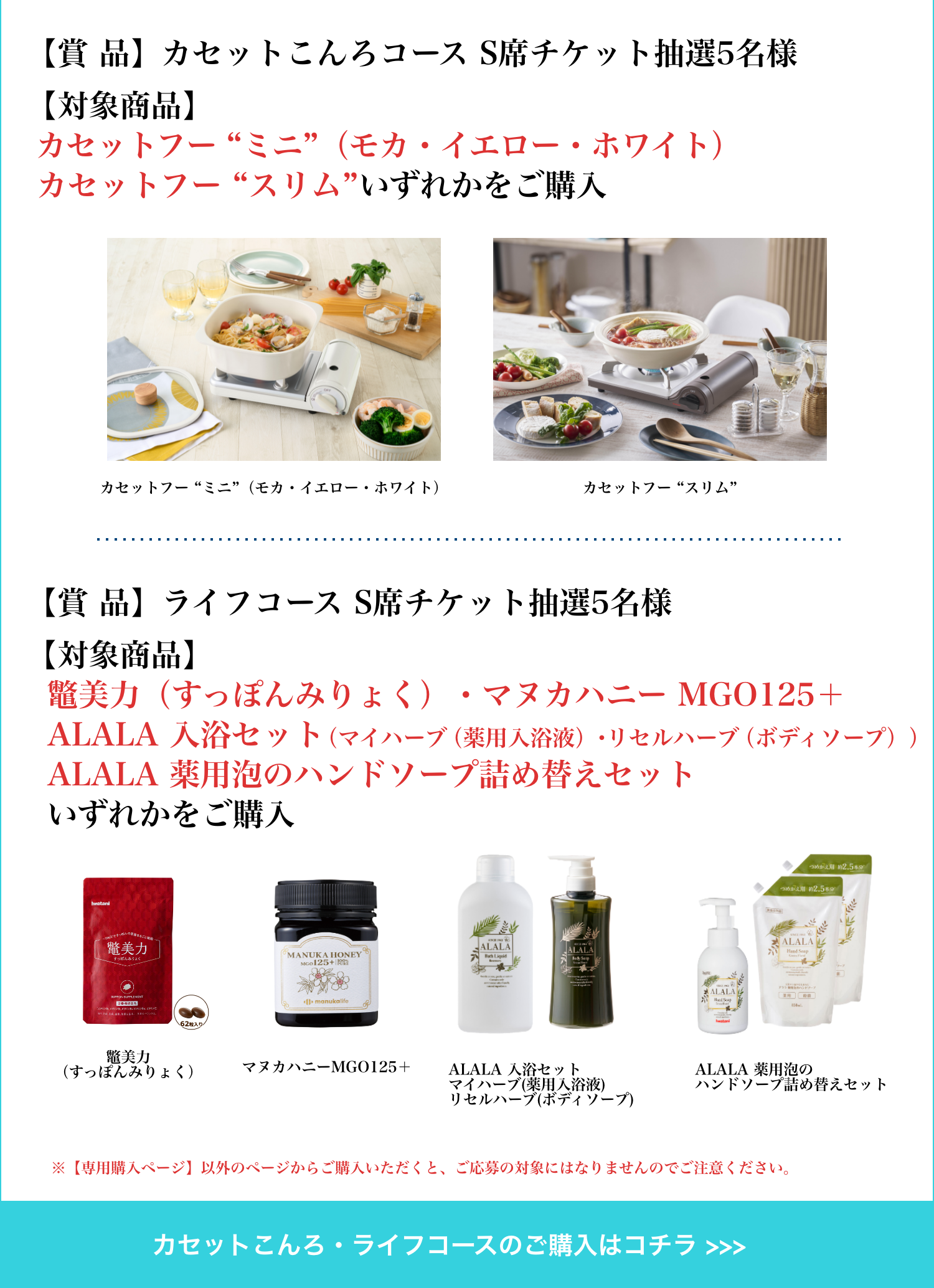 暁 千星賞(抽選)およびS席チケット賞(カセットこんろコース・ライフコース)(抽選)は、対象商品のご購入でご応募が完了します。何口でもご応募可能ですが、厳正なる抽選の上、ご当選はおひとり様1回限り(1席分)となります。