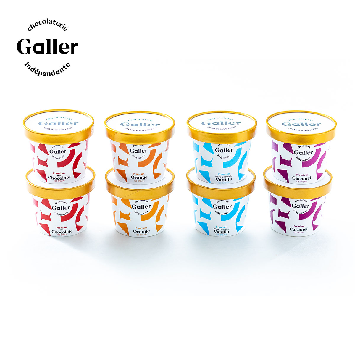 チョコにこだわる『ベルギー王室ご用達ガレー』監修のチョコレートアイスクリームの詰合せ。バニラアイスクリームに、ホワイトチョコを加えたなめらかな食感の「ホワイトチョコレートバニラ」、スイートチョコに乳製品を加えまろやかな味に仕上げた「ミルクチョコレート」、ホワイトチョコにほんのり甘く香ばしいキャラメルを加えた「キャラメル」とチョコレートアイスにオレンジピールを混ぜ込んだ「オランジェ」の4種揃えたカッププレミアムチョコアイスのセットです。