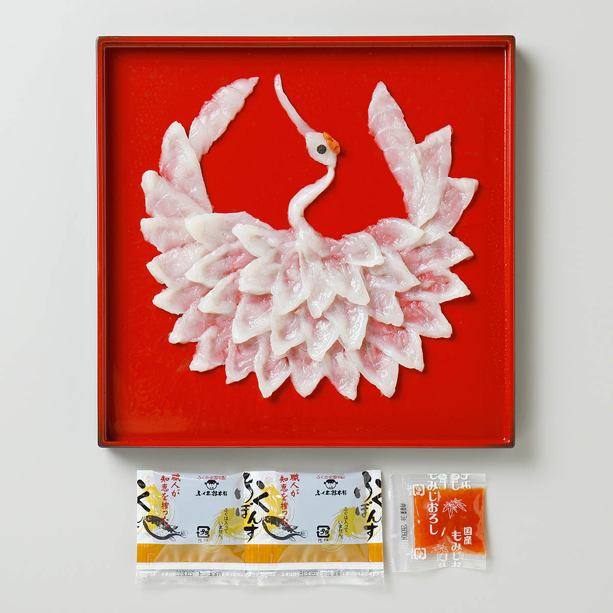 まふく刺身鶴盛り50g(目:トラフグ皮、頭:モミジオロシ)(21cm角プラスチック皿)、ポン酢10g×2、モミジオロシ3g「お父さんありがとう」のメッセージ入りしおり