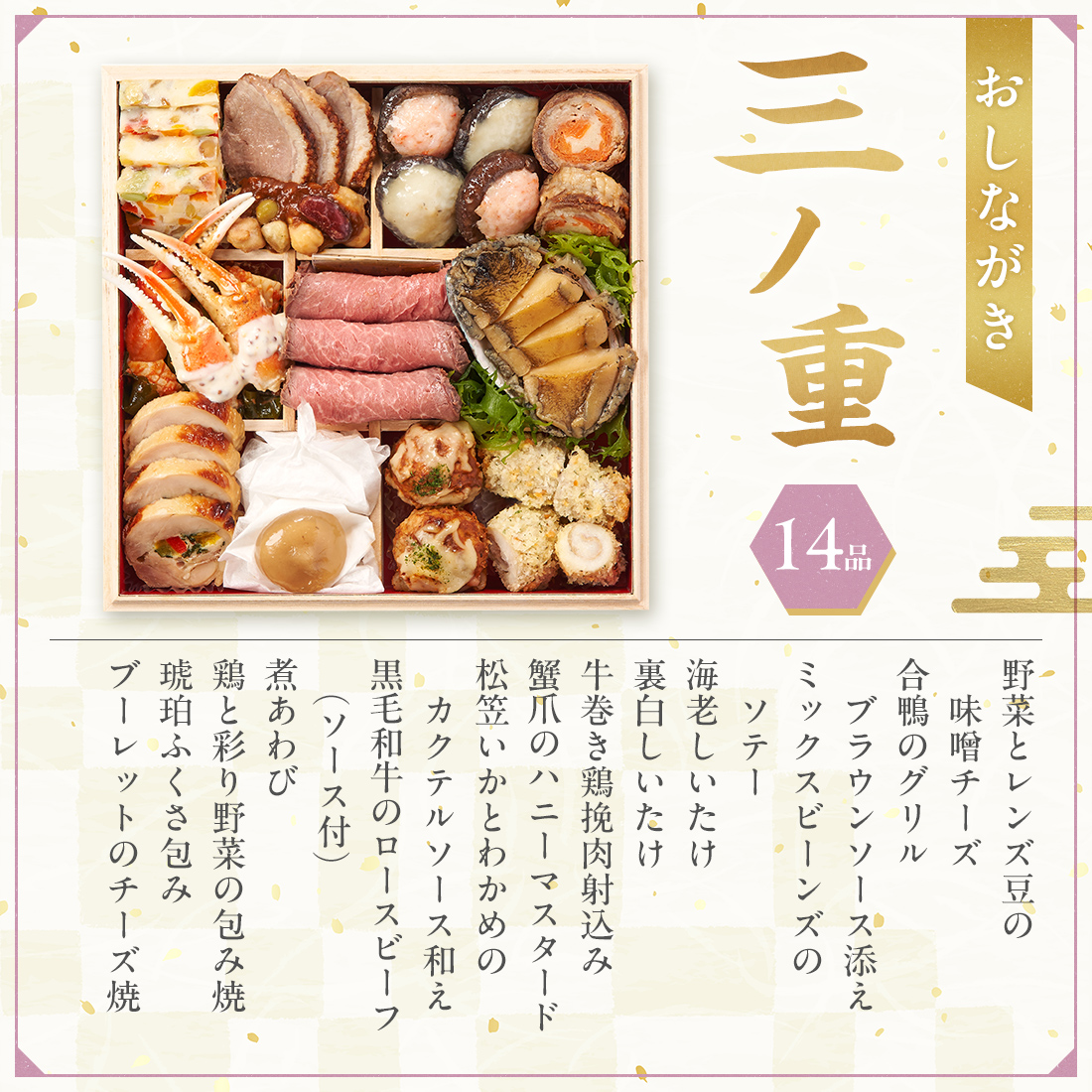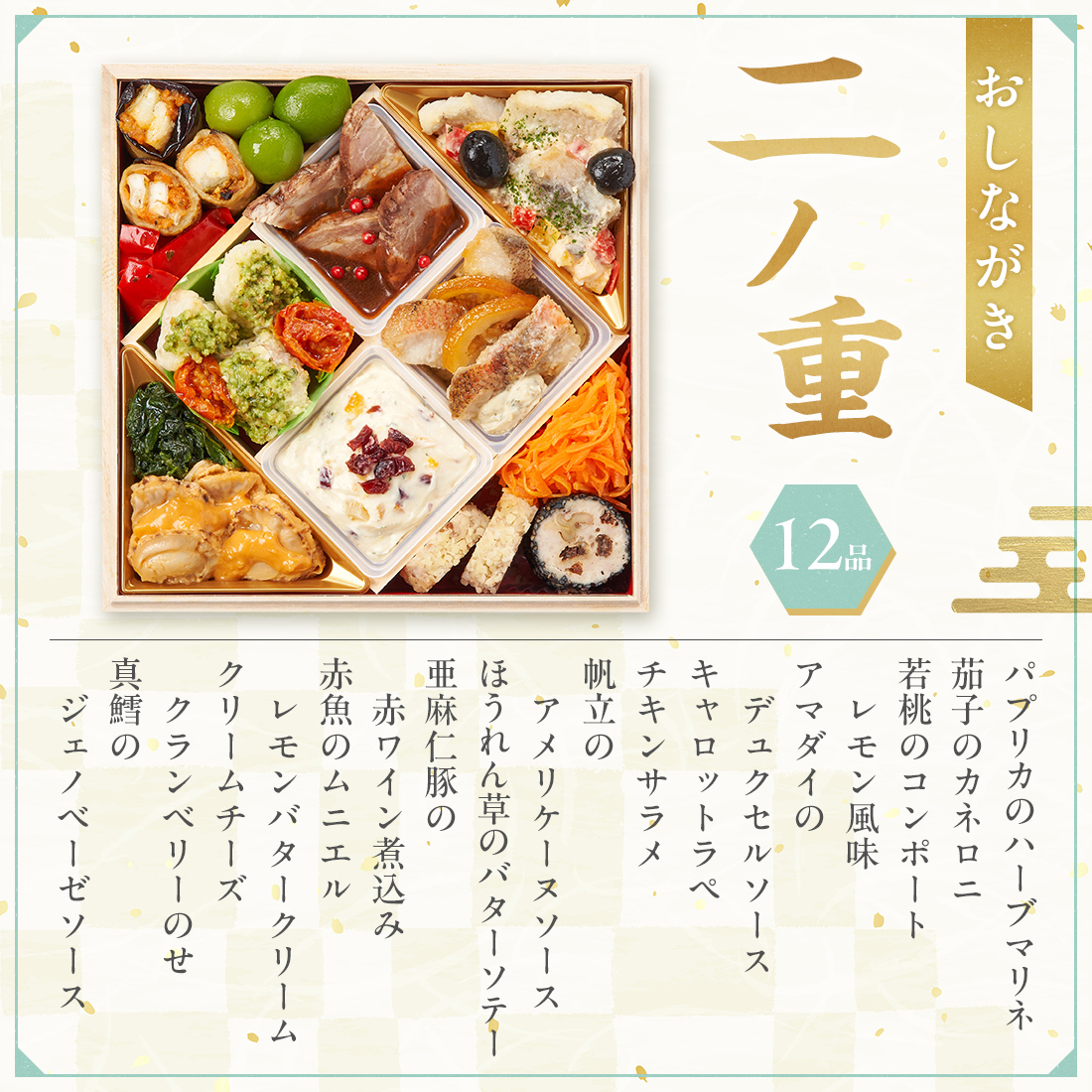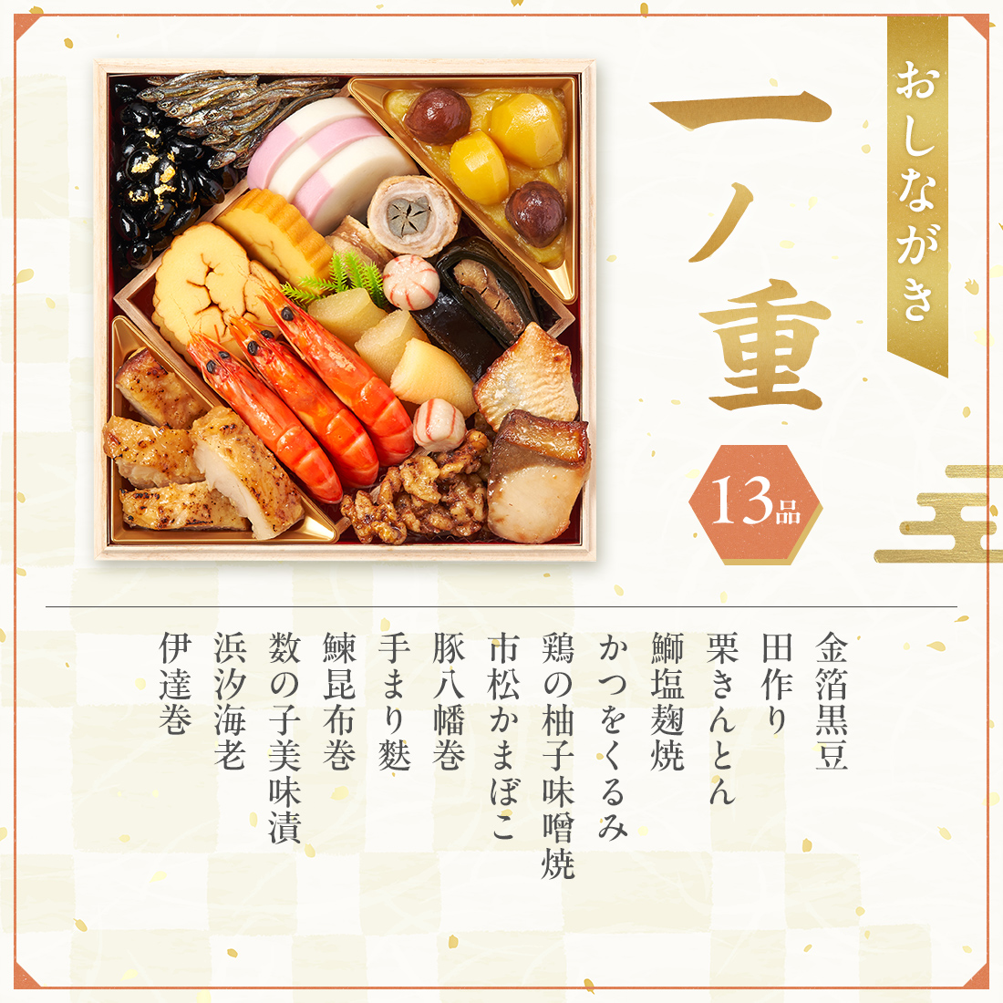 金箔黒豆 50g、田作り 15g、栗きんとん 80g、 鰤塩麹焼 2切、かつをくるみ 25g、鶏の柚子味噌焼 4切、市松かまぼこ 3切、豚八幡巻 3切、手まり麩 2個、 鰊昆布巻 3切、数の子美味漬 3切、浜汐海老 3尾、伊達巻 3切