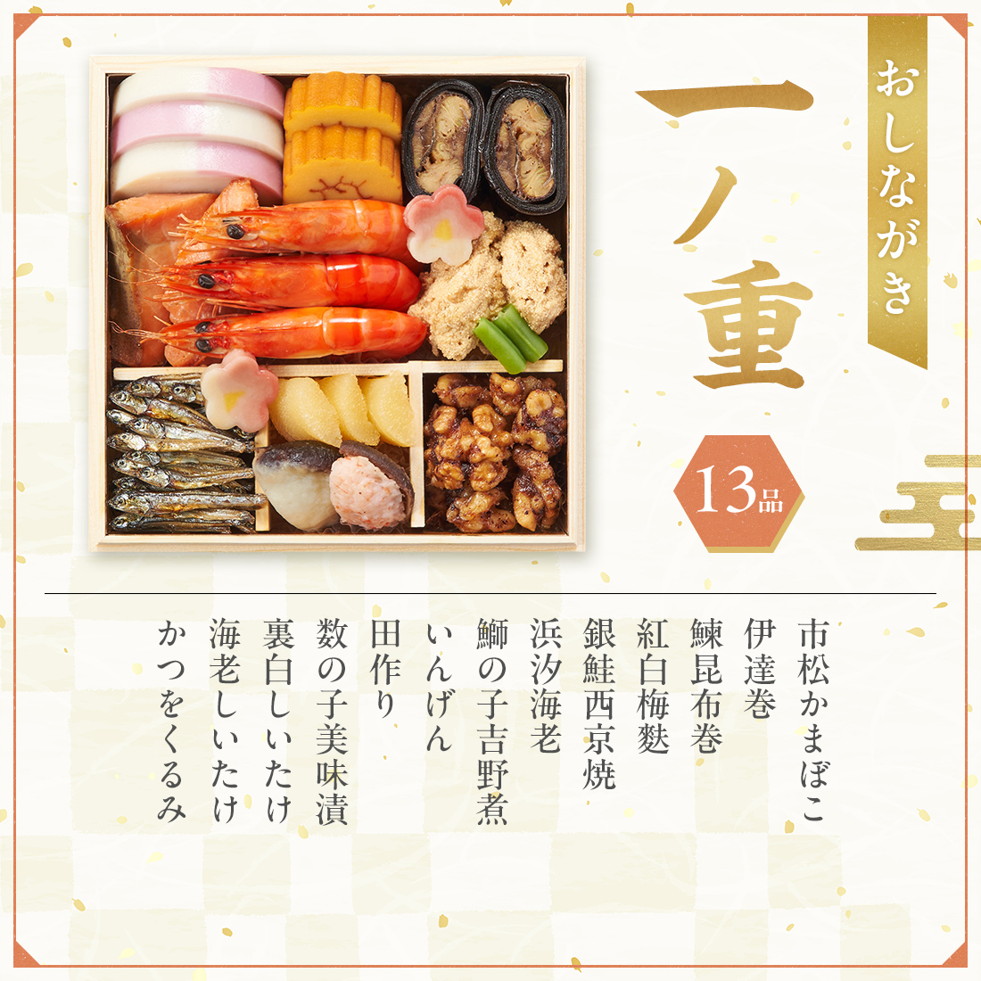 市松かまぼこ 3切、伊達巻 2切、 鰊昆布巻 2切、紅白梅麩 2切、銀鮭西京焼 2切、浜汐海老3尾、 鰤の子吉野煮 2個、いんげん 2切、田作り 20g、数の子美味漬 3切、裏白しいたけ 1切、海老しいたけ 1切、かつをくるみ 30g
