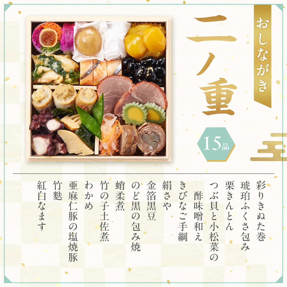 彩りきぬた巻 3切、琥珀ふくさ包み 2個、栗きんとん 50g、つぶ貝と小松菜の酢味噌和え 40g、きびなご手綱 3切、絹さや 2切、金箔黒豆 35g、のど黒の包み焼 3個、蛸柔煮 4切、竹の子土佐煮 2切、わかめ 15g、亜麻仁豚の塩焼豚 2切、竹麩 2切、紅白なます 20g、牛八幡巻 3切