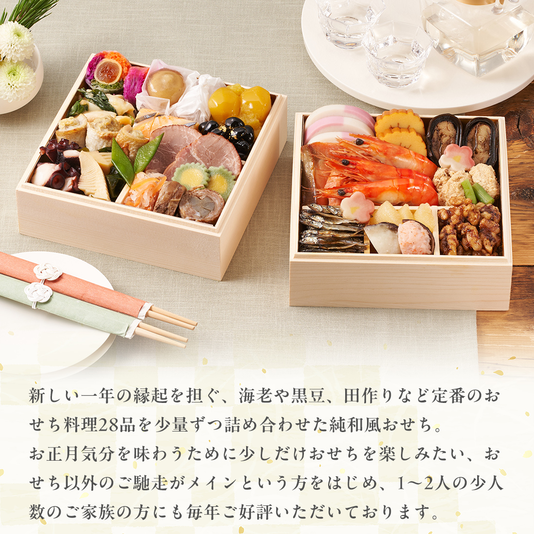 新しい一年の縁起を担ぐ、海老や黒豆、田作りなど定番のおせち料理28品を少量ずつ詰め合わせた純和風おせち。