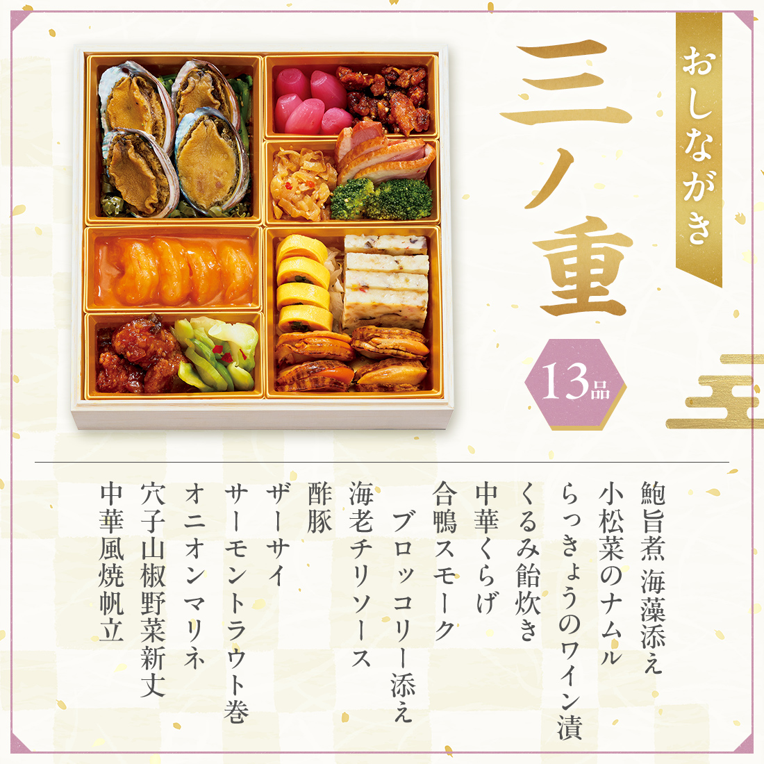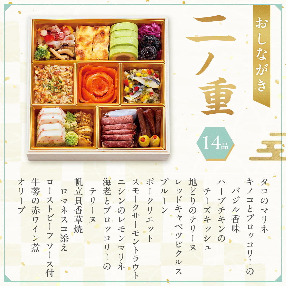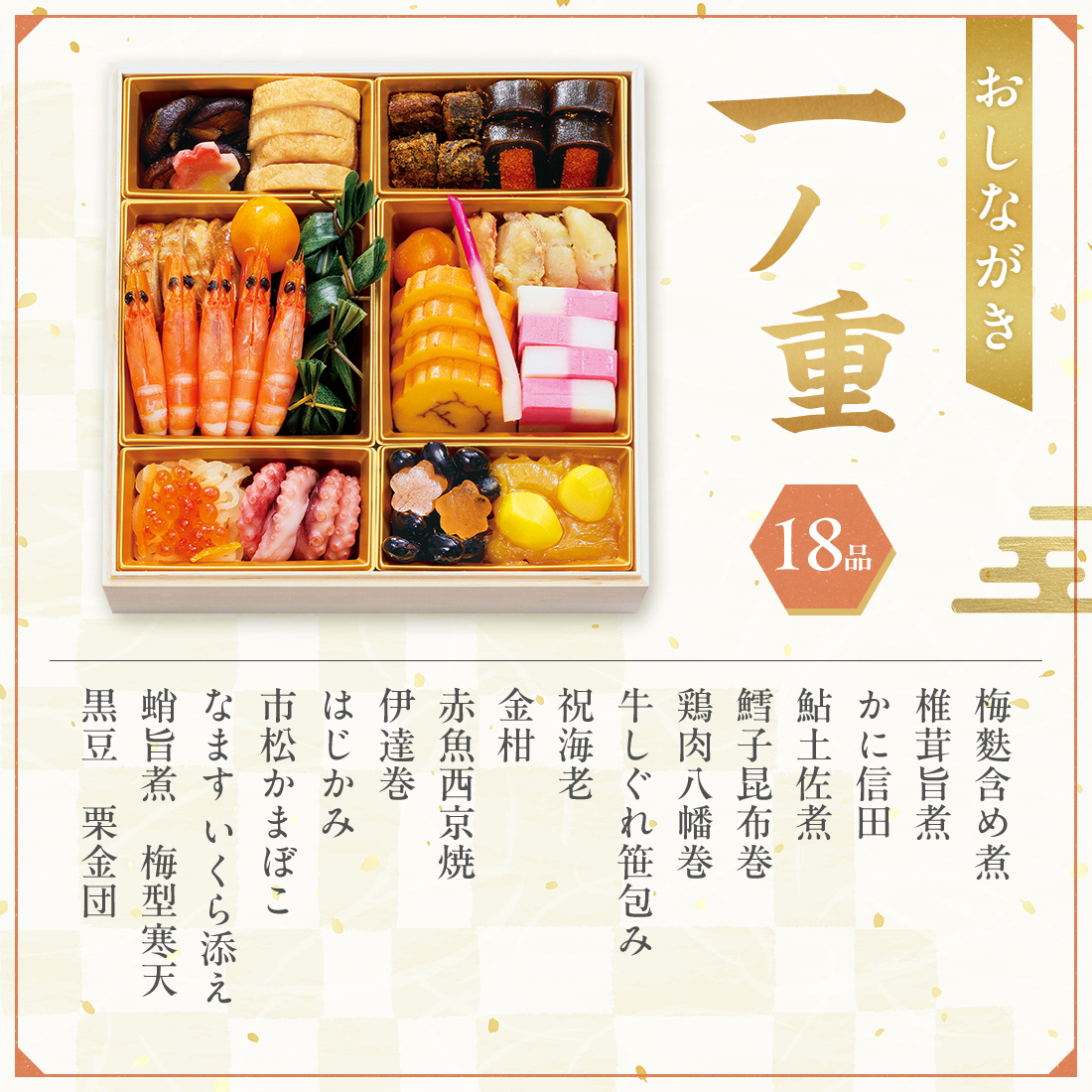 梅麩含め煮、椎茸旨煮、かに信田、鮎土佐煮、鱈子昆布巻、鶏肉八幡巻、牛しぐれ笹包み、祝海老、金柑、赤魚西京焼、伊達巻、はじかみ、市松かまぼこ、なます いくら添え、蛸旨煮、梅型寒天、黒豆、栗金団