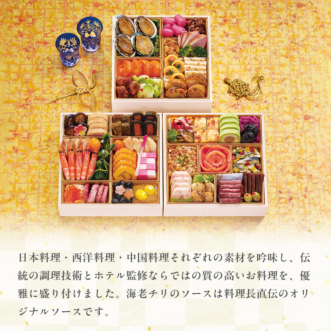歴史と伝統に培われた、「ハイアット リージェンシー 東京」総料理長 星野勝明監修による彩り豊かな和洋中おせち。日本料理・西洋料理・中国料理それぞれの素材を吟味し、伝統の調理技術とホテル監修ならではの質の高いお料理を、優雅に盛り付けました。三の重の海老チリのソースは料理長直伝のオリジナルソースです。