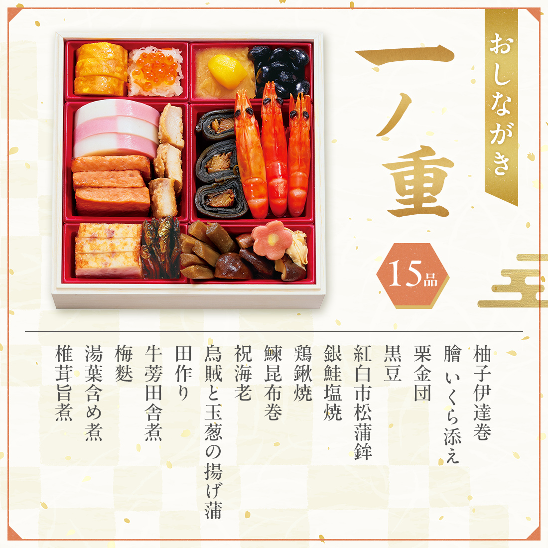 柚子伊達巻、膾 いくら添え、栗金団、黒豆、紅白市松蒲鉾、銀鮭塩焼、鶏鍬焼、鰊昆布巻、祝海老、烏賊と玉葱の揚げ蒲、田作り、牛蒡田舎煮、梅麩、湯葉含め煮、椎茸旨煮