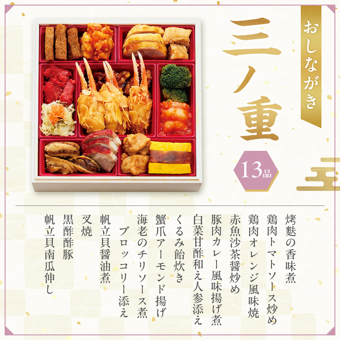 第十代総料理長 伊藤博之の監修による、歴史と伝統の味が盛り込まれた和洋中おせち。伝統的なおせちに加えて海と山の食材を使った多彩なメニューを味わえるのが魅力。新春を迎えるにふさわしく上品に仕上げました。