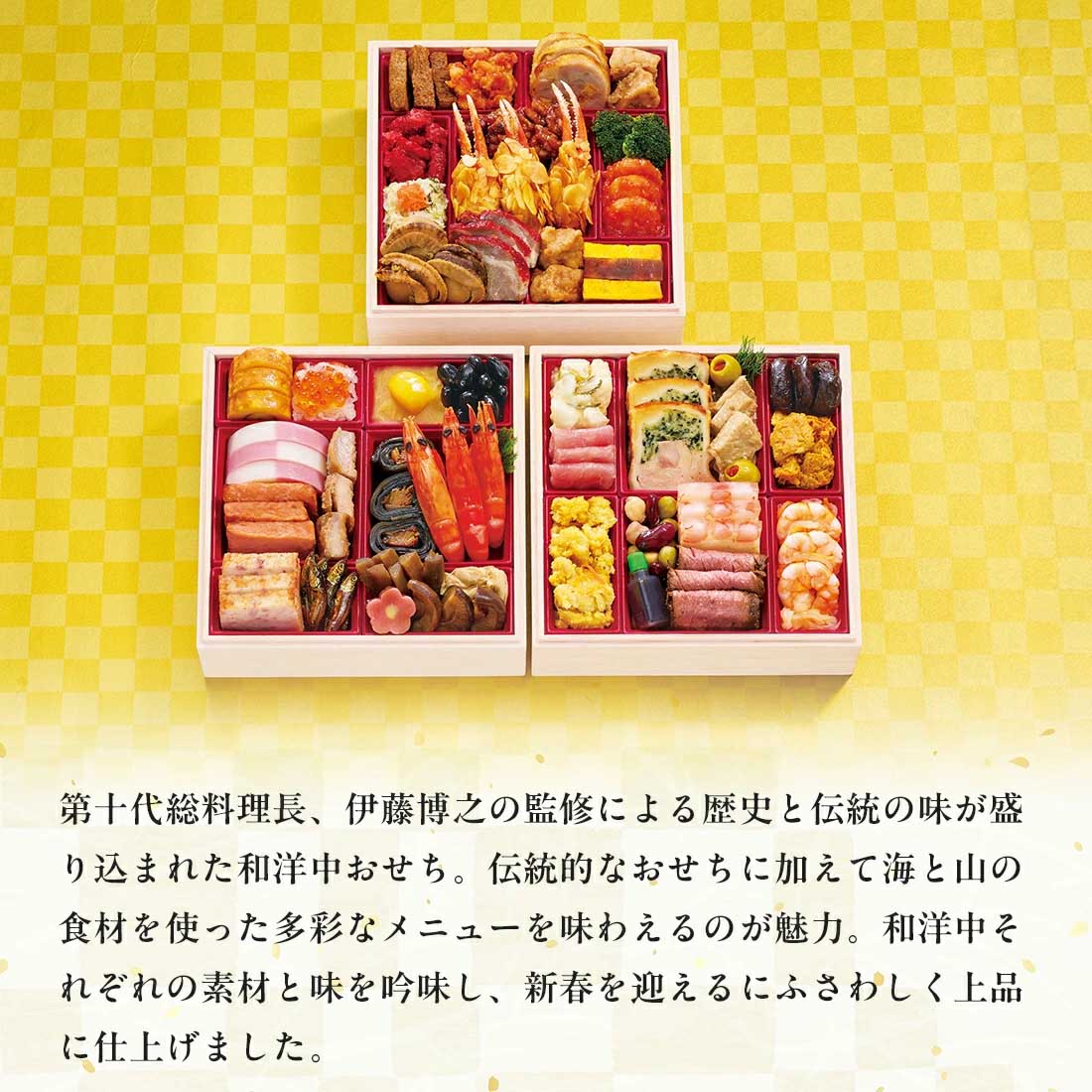 第十代総料理長、伊藤博之監修による、歴史と伝統の味が盛り込まれた和洋中おせち。伝統的なおせちに加えて海と山の食材を使った多彩なメニューを味わえるのが魅力。和洋中それぞれの素材と味を吟味し、新春を迎えるにふさわしく上品に仕上げました。