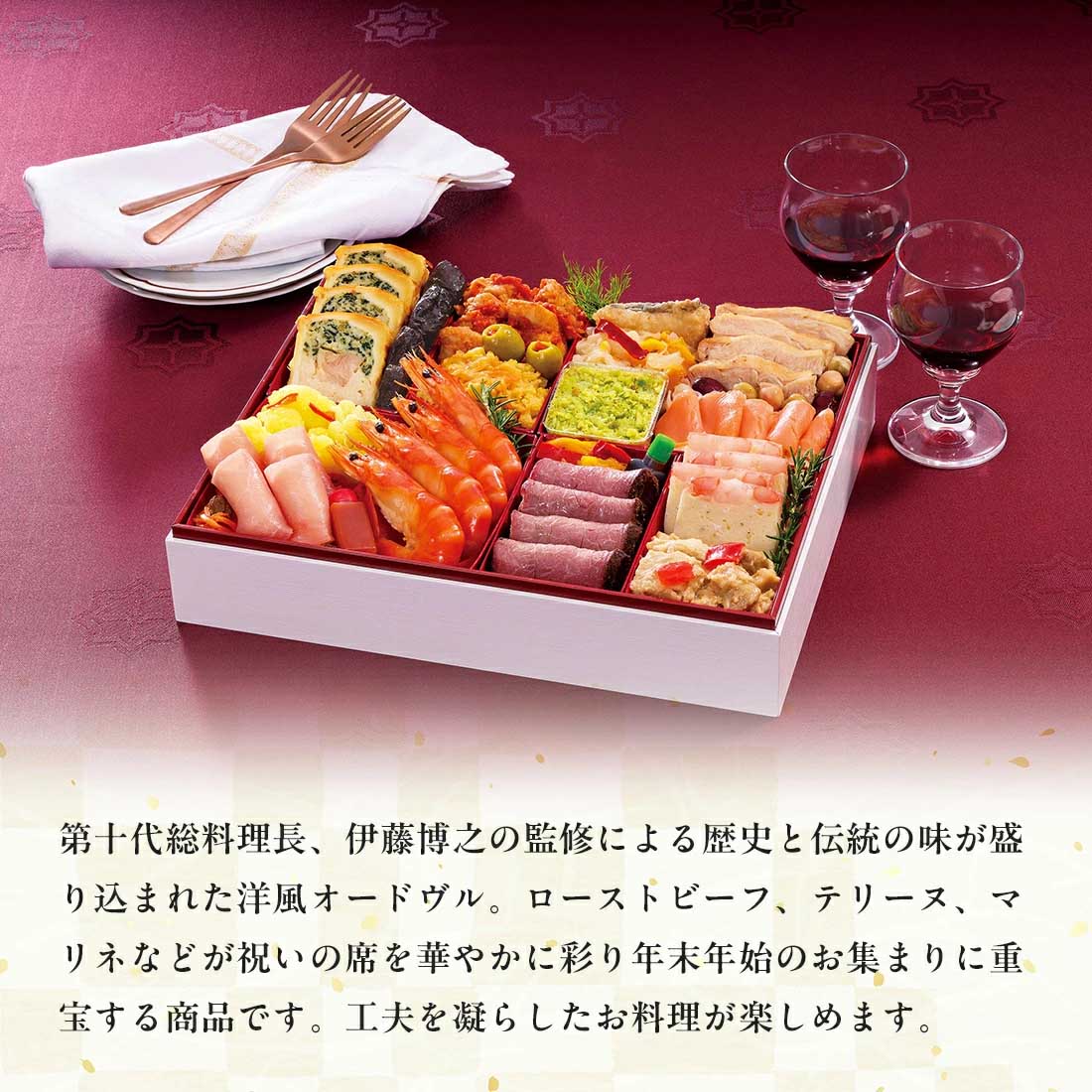 第十代総料理長伊藤博之監修による、歴史と伝統の味が盛り込まれた洋風オードヴル。ローストビーフ、テリーヌ、マリネなどご家庭ではなかなか作れないお料理が、祝いの席を華やかに彩り、クリスマスや年末年始のお集まりに重宝する商品です。工夫を凝らしたお料理が楽しめます。