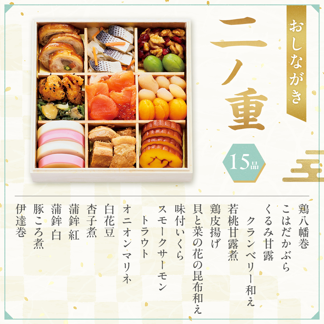 鶏八幡巻、こはだかぶら、くるみ甘露クランベリー和え、若桃甘露煮、鶏皮揚げ、貝と菜の花の昆布和え、味付いくら、スモークサーモントラウト、オニオンマリネ、白花豆、杏子煮、蒲鉾 紅、蒲鉾 白、豚ころ煮、伊達巻