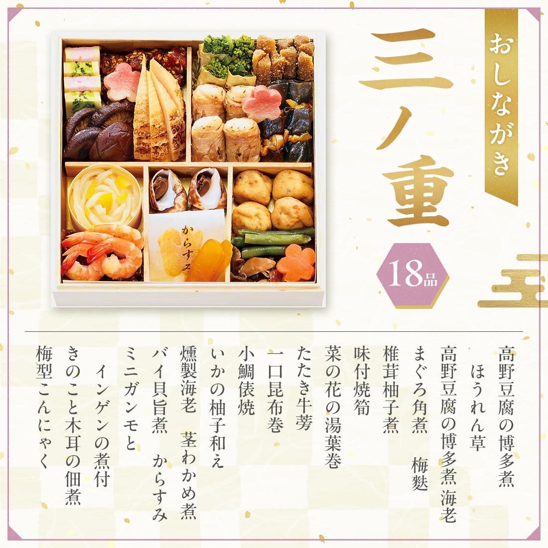 高野豆腐の博多煮ほうれん草、高野豆腐の博多煮海老、まぐろ角煮 、梅麩、椎茸柚子煮、味付焼筍、菜の花の湯葉巻、たたき牛蒡、一口昆布巻 、小鯛俵焼、いかの柚子和え、燻製海老、茎わかめ煮、バイ貝旨煮、からすみ、ミニガンモとインゲンの煮付、きのこと木耳の佃煮、梅型こんにゃく