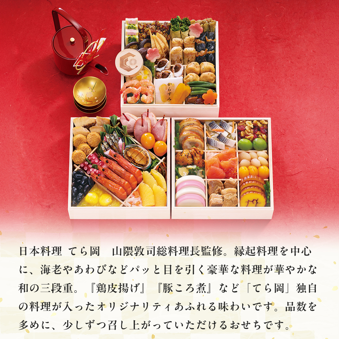 日本料理 てら岡 山隈敦司料理長監修。縁起料理を中心に、海老やあわびなど豪華な料理が華やかな和の三段重。『知鳥鶏』『いかの柚子和え』など独自の料理が入ったオリジナリティあふれる味わいです。