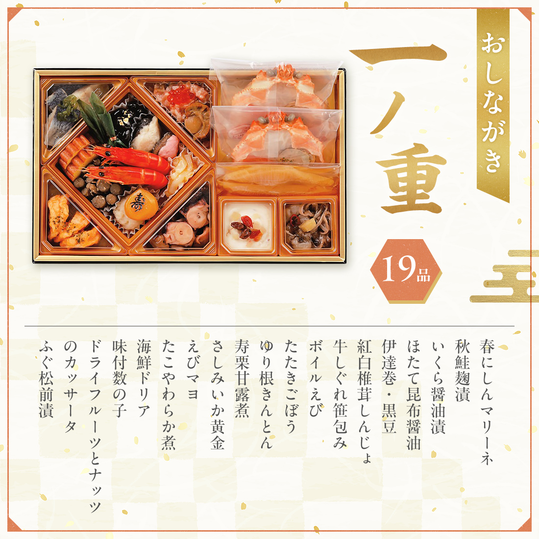 春にしんマリーネ60g、秋鮭麹漬40g、いくら醤油漬、ほたて昆布醤油2個、伊達巻2切、黒豆30g、紅白椎茸しんじょ2個、牛しぐれ笹包み2個、ボイルえび2尾、たたきごぼう20g、ゆり根きんとん30g、寿栗甘露煮1個、さしみいか黄金30g、えびマヨ3尾、たこやわらか煮50g、海鮮ドリア2個、味付数の子2本、ドライフルーツとナッツのカッサータ60g、ふぐ松前漬50g