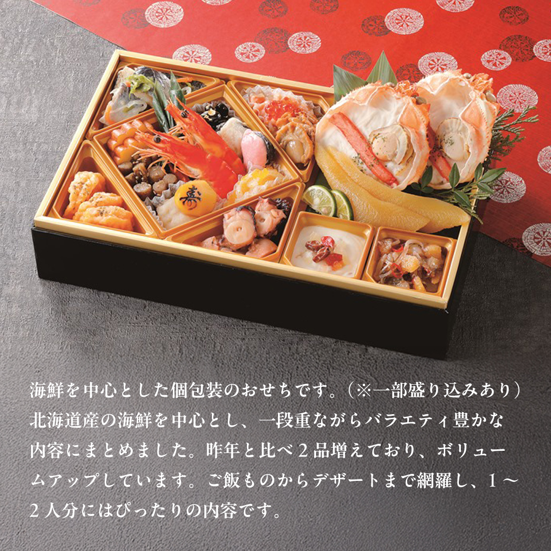 北海道産の海鮮を中心とし、一段重ながらバラエティ豊かな内容にまとめました。昨年と比べ2品増えており、ボリュームアップしています。ご飯ものからデザートまで網羅し、1~2人分にはぴったりの内容です。