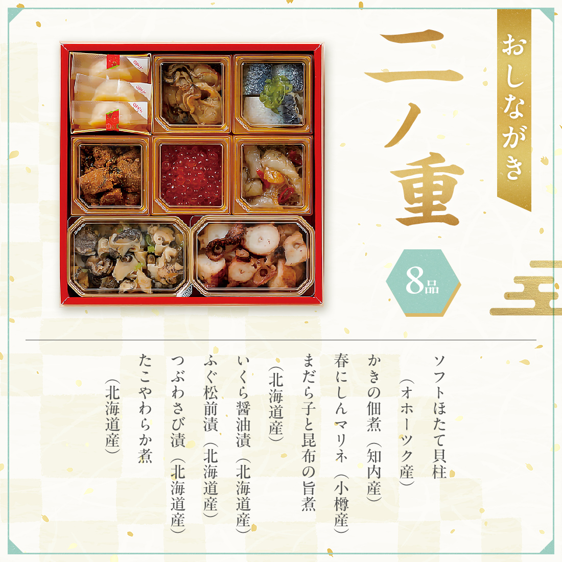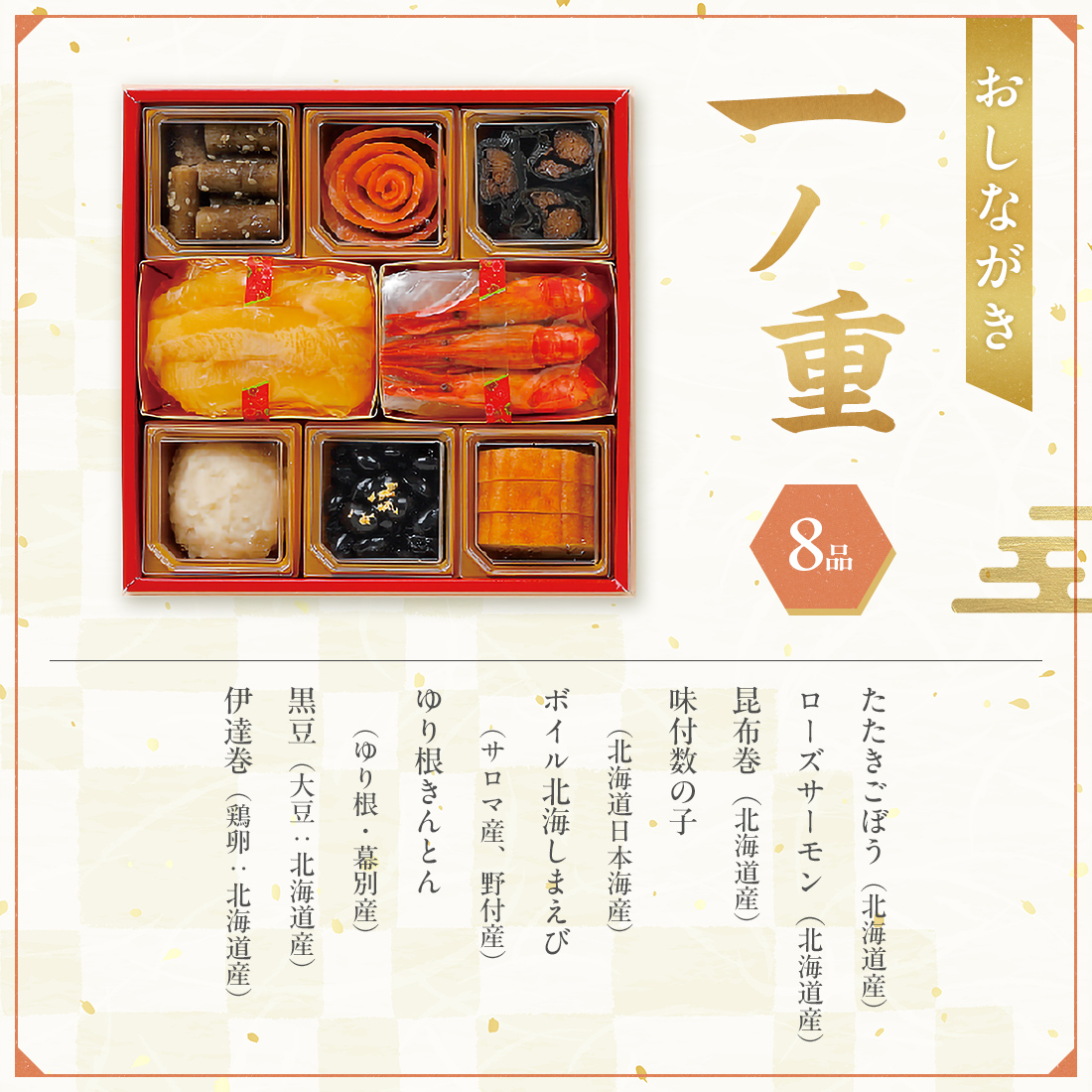 たたきごぼう(北海道産)、ローズサーモン(北海道産)、昆布巻(北海道産)、味付数の子(北海道日本海産)、ボイル北海しまえび(サロマ産、野付産)、ゆり根きんとん(ゆり根・幕別産)、黒豆(大豆:北海道産)、伊達巻(鶏卵:北海道産)