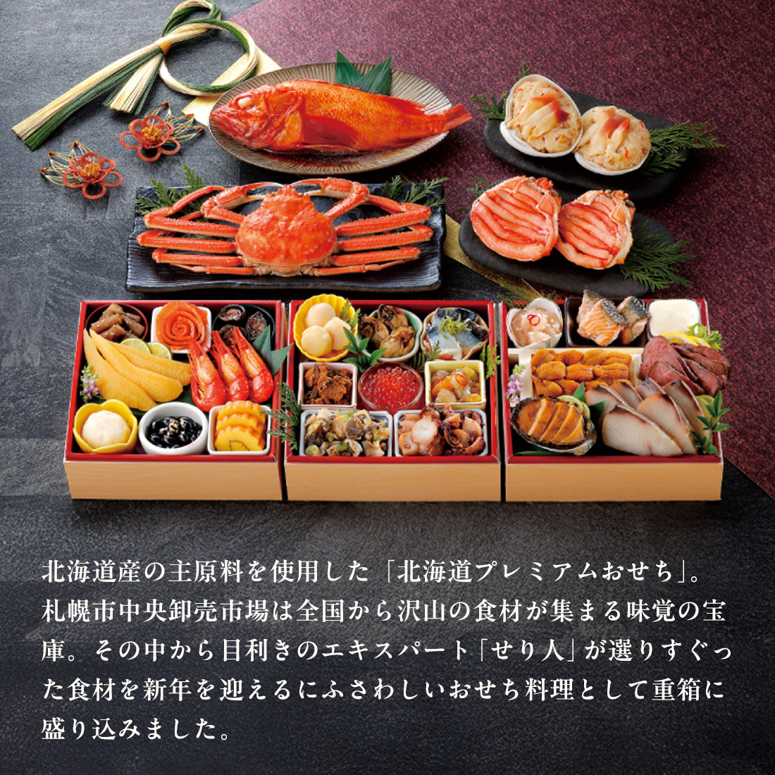 北海道産の主原料を使用した「北海道プレミアムおせち」。札幌市中央卸売市場は全国から沢山の食材が集まる味覚の宝庫。その中から目利きのエキスパート「せり人」が選りすぐった食材を新年を迎えるにふさわしいおせち料理として重箱に盛り込みました。