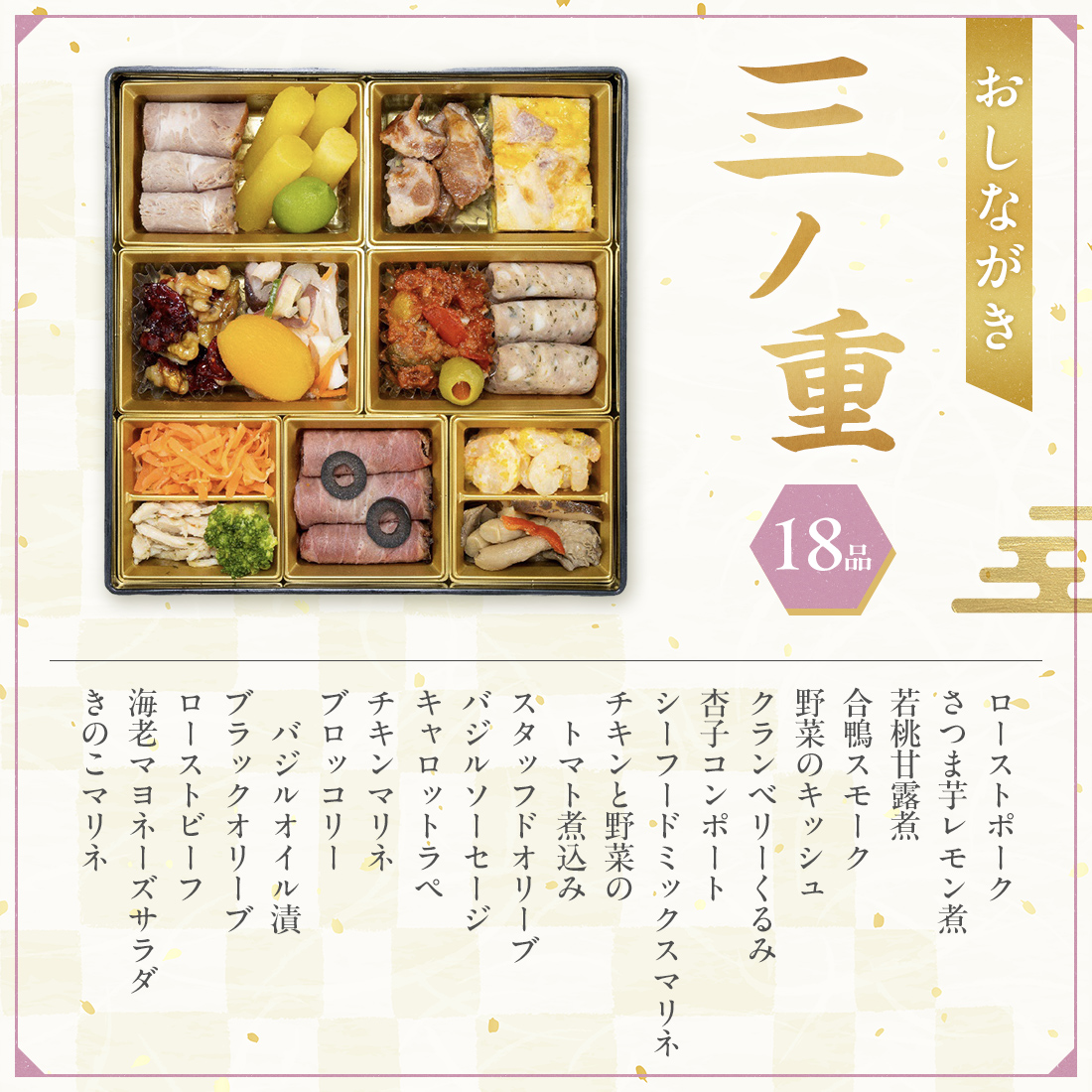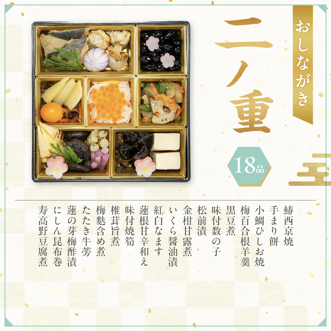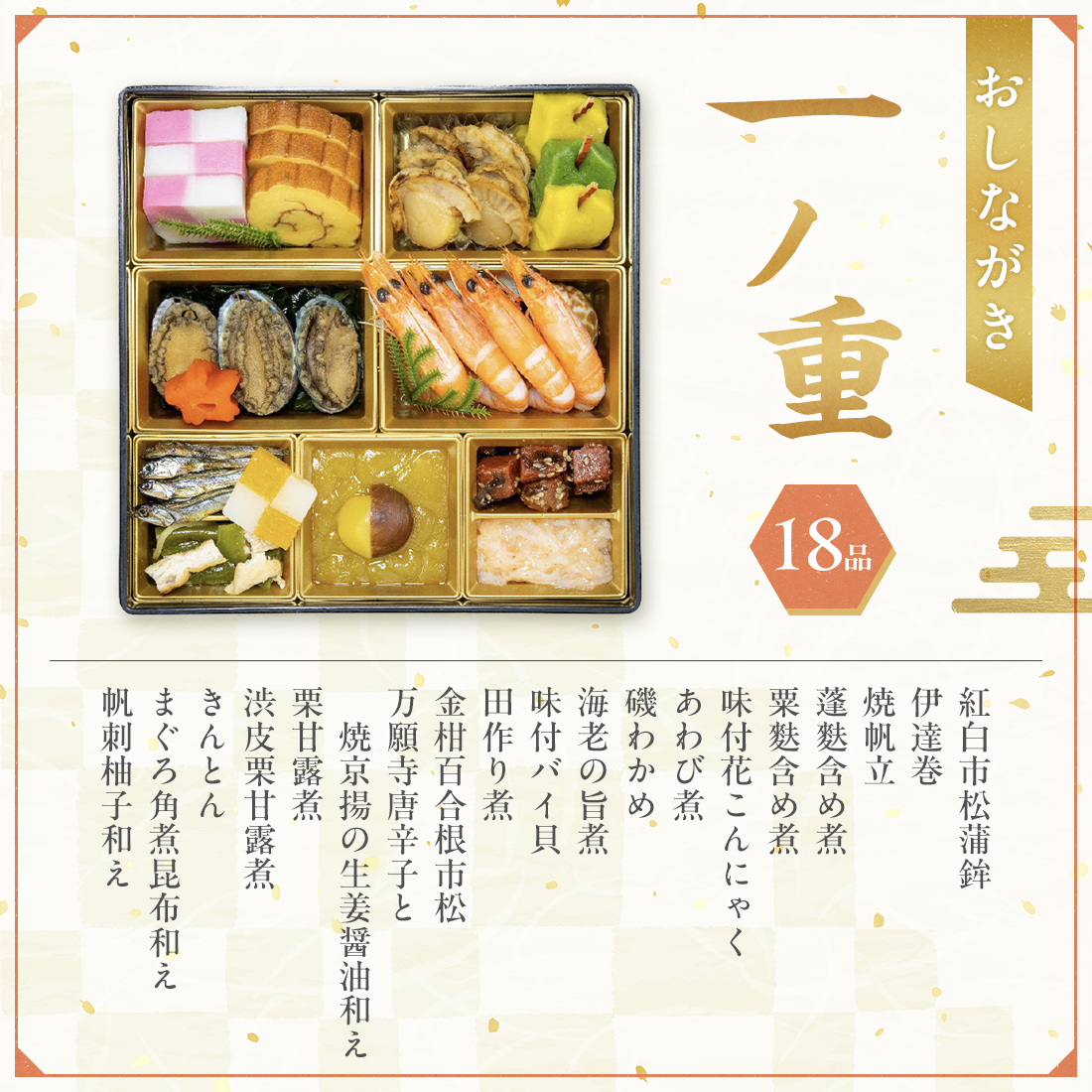 紅白市松蒲鉾 3、伊達巻 3、焼帆立 4、蓬麩含め煮 1、粟麩含め煮 2、味付花こんにゃく 1、あわび煮 3、磯わかめ 30g、海老の旨煮 4、味付バイ貝 2、田作り煮 15g、金柑百合根市松 1、万願寺唐辛子と焼京揚の生姜醤油和え 25g、栗甘露煮 1、渋皮栗甘露煮 1、きんとん 80g、まぐろ角煮昆布和え 25g、帆刺柚子和え 35g