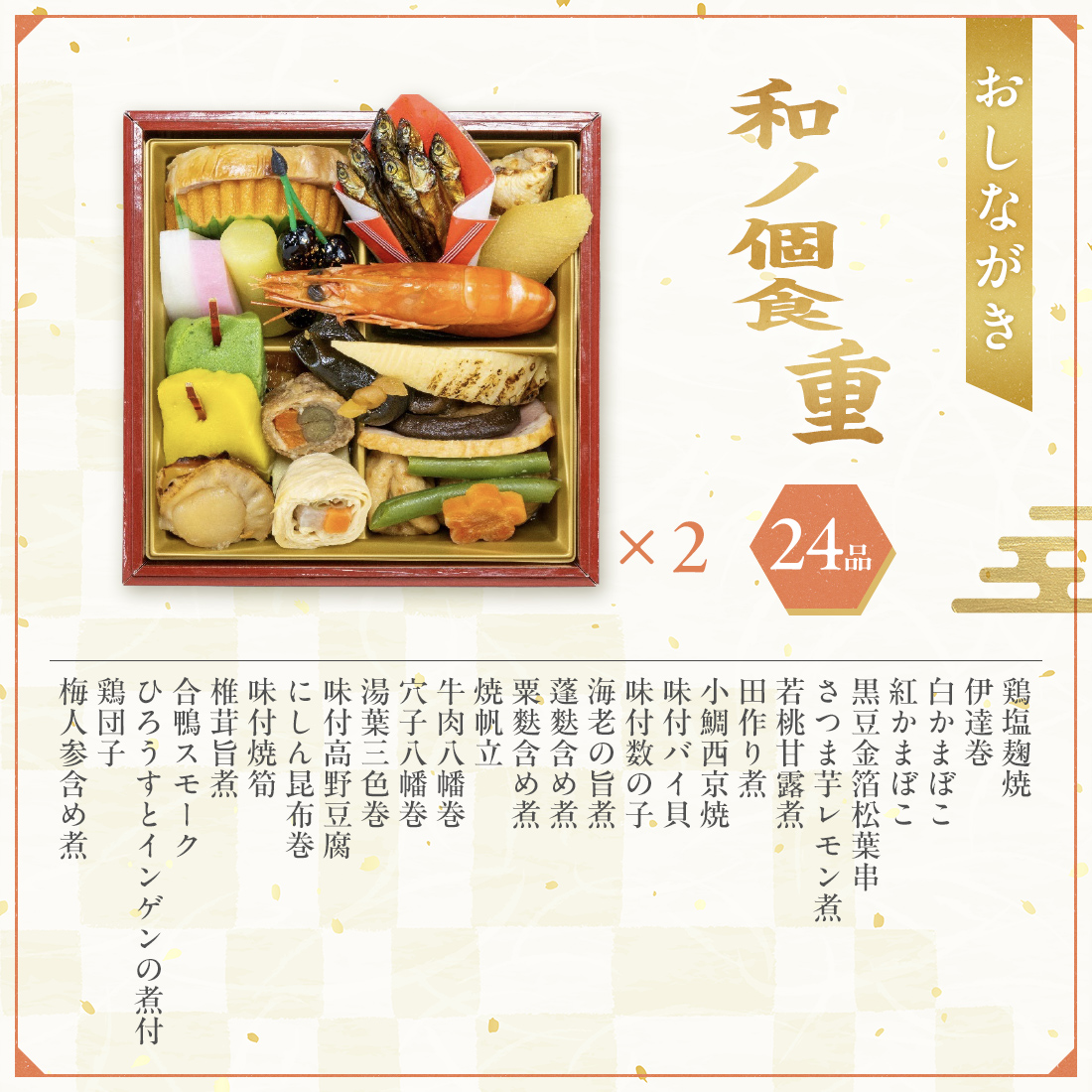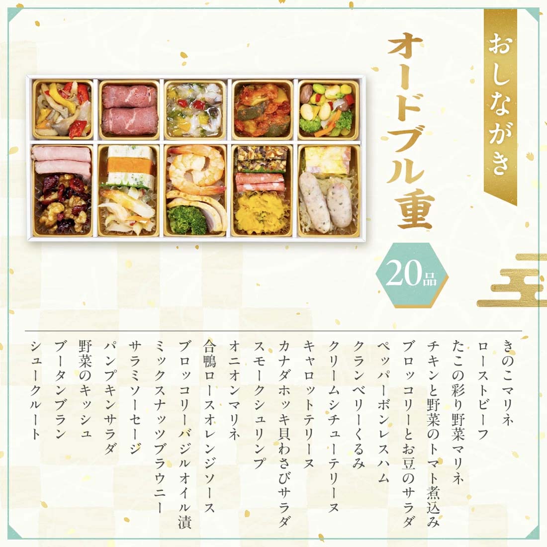 鶏塩麹焼 1、伊達巻 1、白かまぼこ 1、紅かまぼこ 1、黒豆金箔松葉串 1、さつま芋レモン煮 1、若桃甘露煮 1、田作り煮 5g、小鯛西京焼 1、味付バイ貝 1、味付数の子 1、海老の旨煮 1、蓬麩含め煮 1、粟麩含め煮 1、焼帆立 1、牛肉八幡巻 1、穴子八幡巻 1、湯葉三色巻 1、味付高野豆腐 1、にしん昆布巻 1、味付焼筍 1、椎茸旨煮 1、合鴨スモーク 1、ひろうすとインゲンの煮付 10g、鶏団子 1、梅人参含め煮 1