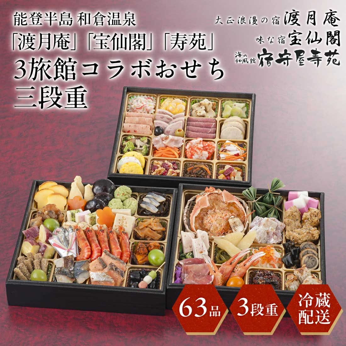 - ★販売開始前 [12月31日お届け 日時配達指定不可]能登半島 和倉温泉「渡月庵」「宝仙閣」「宿守屋 寿苑」3旅館コラボおせち 三段重 <冷蔵>