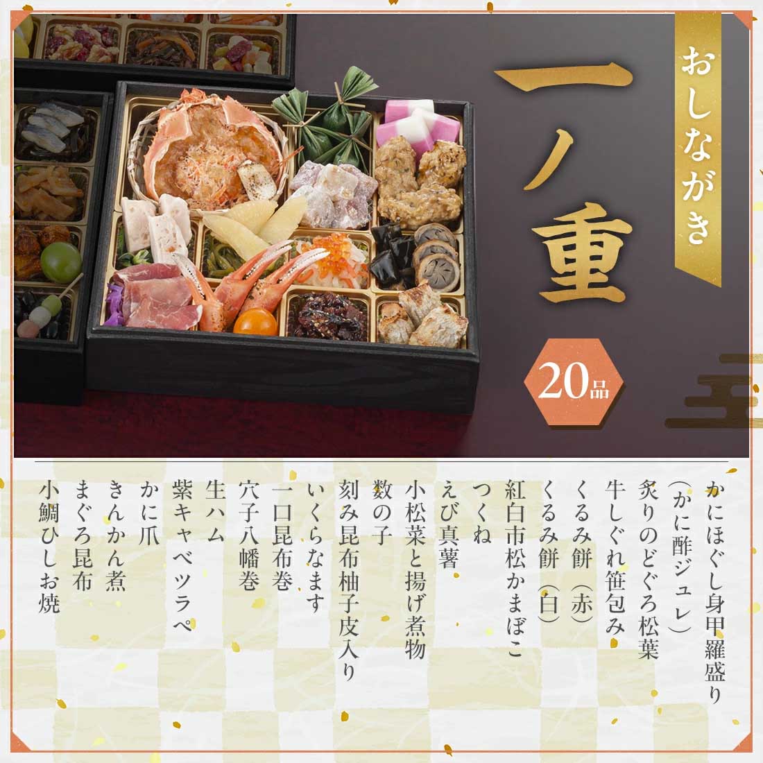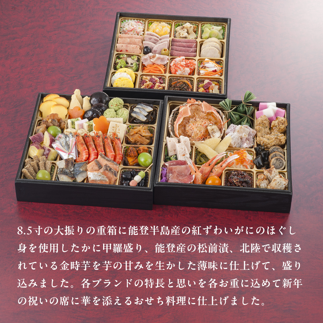 8.5寸の大振りの重箱に能登半島産の紅ずわいがにのほぐし身を使用したかに甲羅盛り、能登産の松前漬、北陸で収穫されている金時芋を芋の甘みを生かした薄味に仕上げて、盛り込みました。各ブランドの特長と思いを各お重に込めて新年の祝いの席に華を添えるおせち料理に仕上げました。