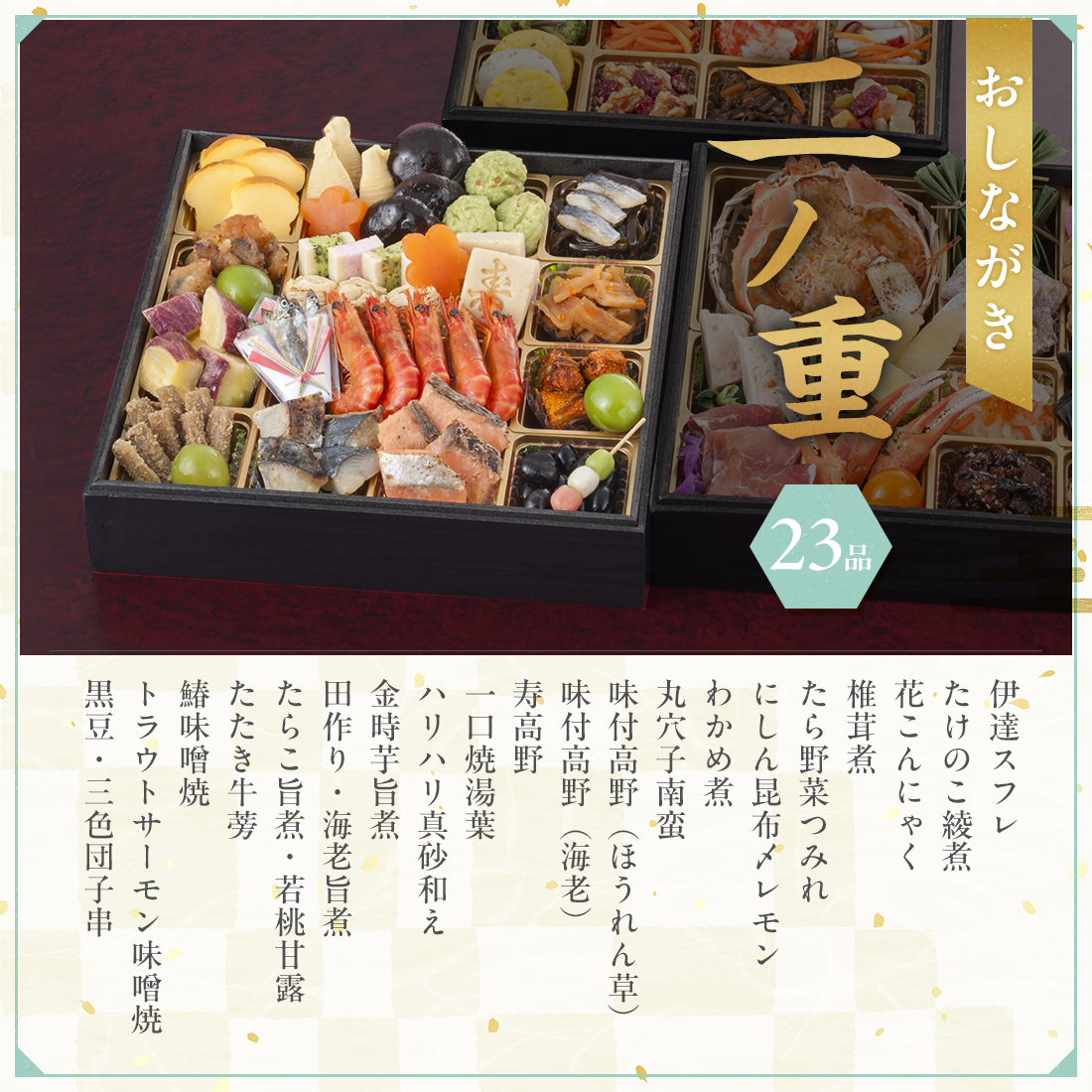 かにほぐし身甲羅盛り(かに酢ジュレ)1個、炙りのどぐろ松葉1本、牛しぐれ笹包み3個、くるみ餅(赤)3個、くるみ餅(白)2個、紅白市松かまぼこ3枚、つくね3個、えび真薯3切、小松菜と揚げ煮物35g、数の子3切、刻み昆布柚子皮入り15g、いくらなます40g、一口昆布巻3個、穴子八幡巻3切、生ハム3枚、紫キャベツラぺ20g、かに爪3本、きんかん煮1個、まぐろ昆布30g、小鯛ひしお焼3個
