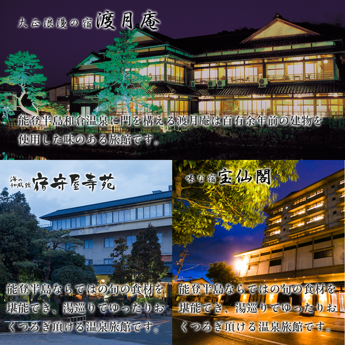 能登半島3旅館コラボ:「和倉温泉・渡月庵」能登半島和倉温泉に門を構える渡月庵は百有余年前の建物を使用した味のある旅館です。古き良きを伝え生きる趣を味わえる旅館、「和倉温泉・宿守屋 寿苑」能登半島ならではの旬の食材を堪能でき、湯巡りでゆったりおくつろぎ頂ける温泉旅館です。、「和倉温泉 宝仙閣」能登半島ならではの旬の食材を堪能でき、湯巡りでゆったりおくつろぎ頂ける温泉旅館です。湯巡りでゆったりおくつろぎ頂ける温泉旅館です。