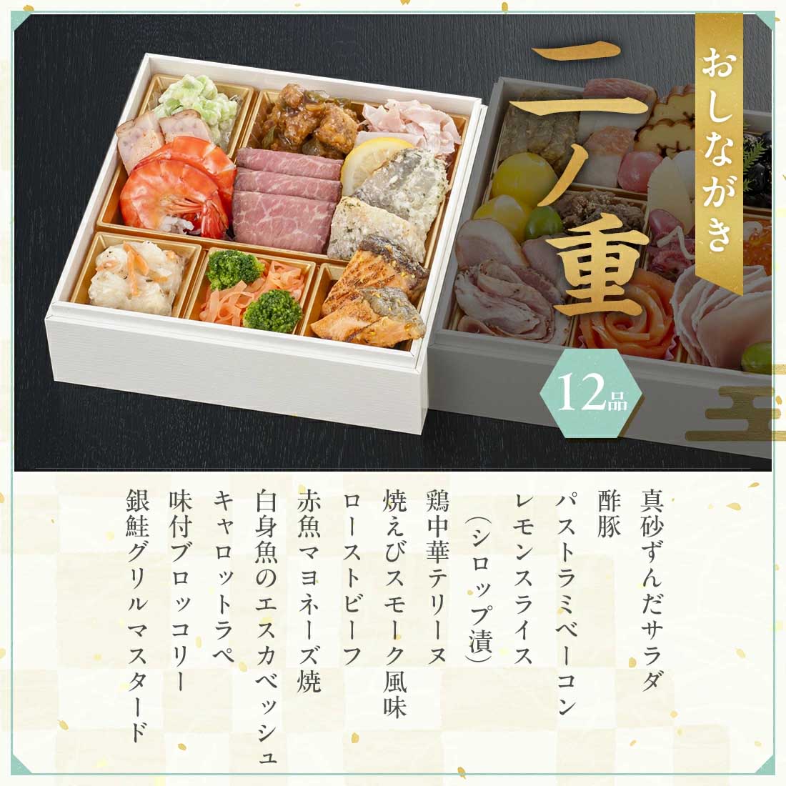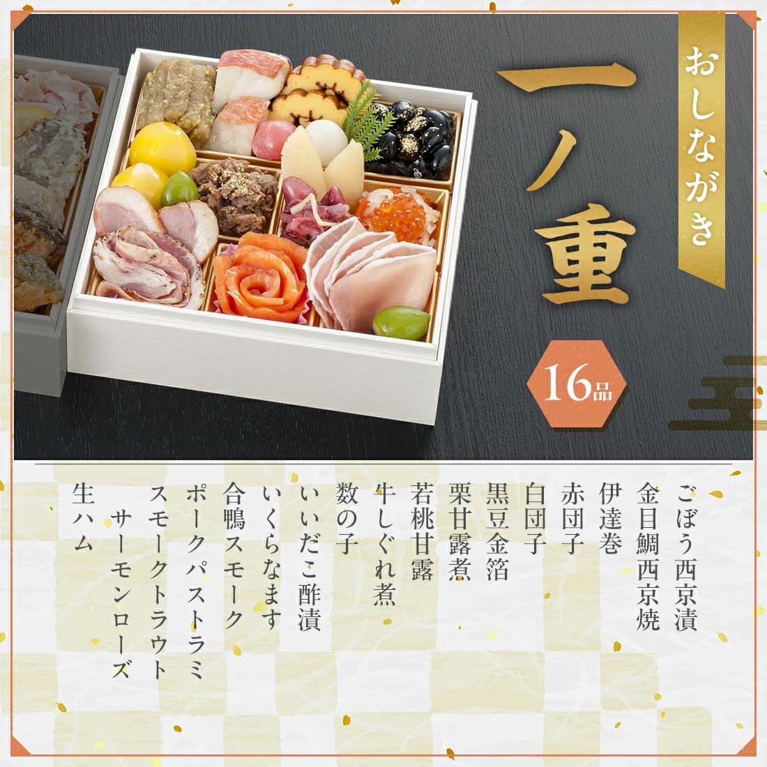 ごぼう西京漬30g、金目鯛西京焼2切、伊達巻2枚、赤団子1個、白団子1個、黒豆金箔30g、栗甘露煮2個、若桃甘露2個、牛しぐれ煮30g、数の子2本、いいだこ酢漬2個、いくらなます30g、合鴨スモーク2枚、ポークパストラミ2枚、スモークトラウトサーモンローズ1個、生ハム3枚