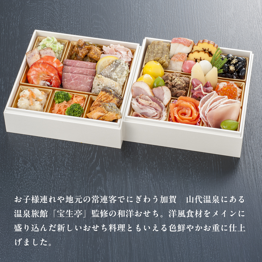 - ★販売開始前[12月31日お届け 日時配達指定不可]加賀温泉郷 山代温泉「宝生亭」和洋おせち 二段重<冷蔵>