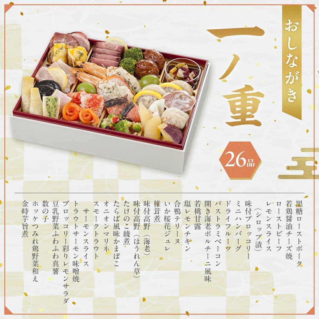 黒糖ローストポーク2切、若鶏醤油チーズ焼2個、ローストビーフ4枚、レモンスライス(シロップ漬)2切、味付ブロッコリー2個、ミニハンバーグ2個、ドライフルーツ20g、パストラミベーコン25g、開き海老ポルチーニ風味2個、若桃甘露2個、塩レモンチキン2切、合鴨テリーヌ2切、いか桜花ジュレ20g、椎茸煮2枚、味付高野(海老)1切、味付高野(ほうれん草)1切、たけのこ綾煮2切、たらば風味かまぼこ2個、オニオンマリネ10g、スモークトラウトサーモンスライス2枚、トラウトサーモン味噌焼2切、ブロッコリー彩りレモンサラダ20g、豆乳野菜ふわふわ真薯2切、数の子2切、ホッケつみれ鶏野菜和え2個、金時芋旨煮2個
