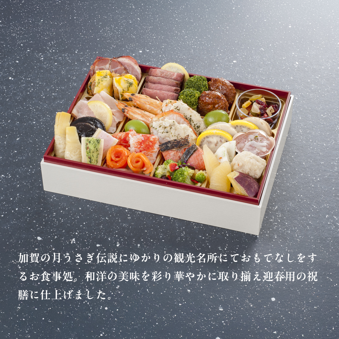 加賀の月うさぎ伝説にゆかりの観光名所にておもてなしをするお食事処。和洋の美味を彩り華やかに取り揃え迎春用の祝膳に仕上げました。