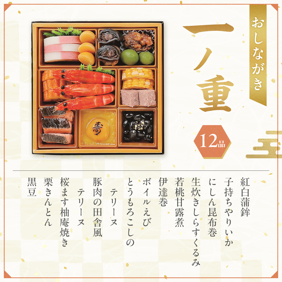 紅白蒲鉾3切、子持ちやりいか3切、にしん昆布巻3切、生炊きしらすくるみ20g、若桃甘露煮2個、伊達巻3切、ボイルえび3尾、とうもろこしのテリーヌ2切、豚肉の田舎風テリーヌ2切、桜ます柚庵焼き3切、栗きんとん50g、黒豆40g