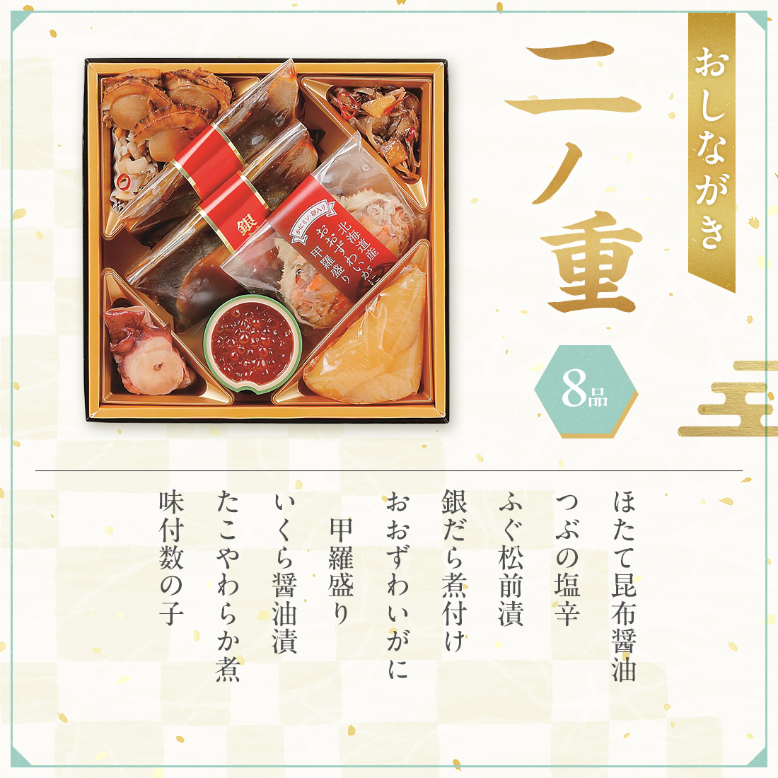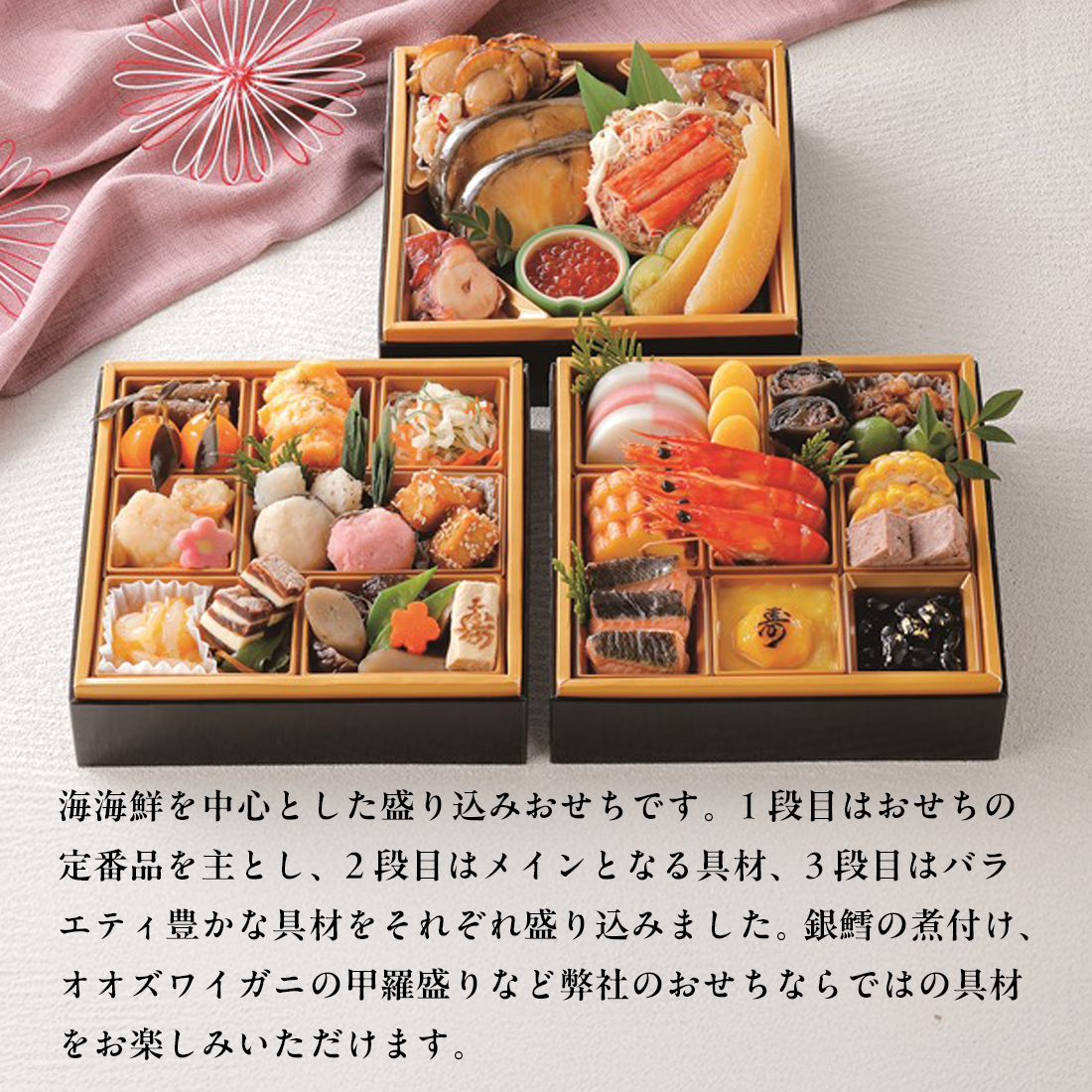 海海鮮を中心とした盛り込みおせちです。1段目はおせちの定番品を主とし、2段目はメインとなる具材、3段目はバラエティ豊かな具材をそれぞれ盛り込みました。銀鱈の煮付け、オオズワイガニの甲羅盛りなど弊社のおせちならではの具材をお楽しみいただけます。