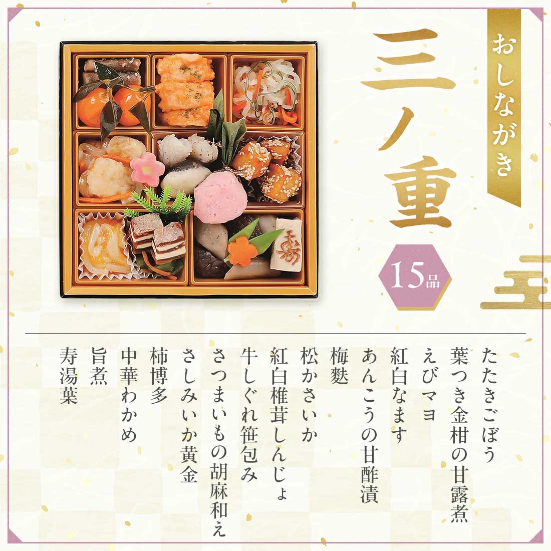 たたきごぼう20g、葉つき金柑の甘露煮2個、えびマヨ3尾、紅白なます40g、あんこうの甘酢漬50g、梅麩1個、松かさいか2個、紅白椎茸しんじょ2個、牛しぐれ笹包み2個、さつまいもの胡麻和え30g、さしみいか黄金30g、柿博多2切、中華わかめ25g、旨煮50g、寿湯葉1個