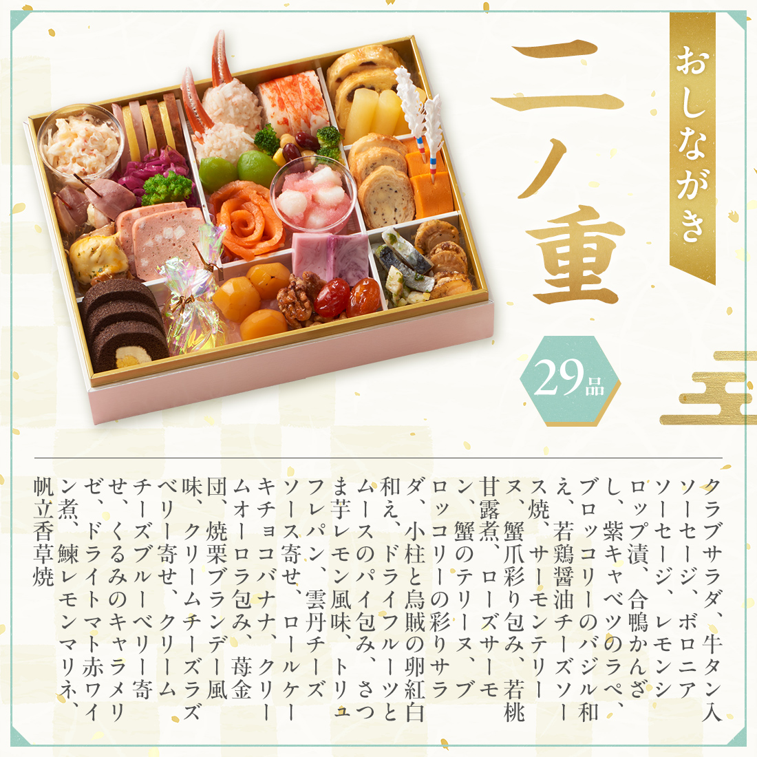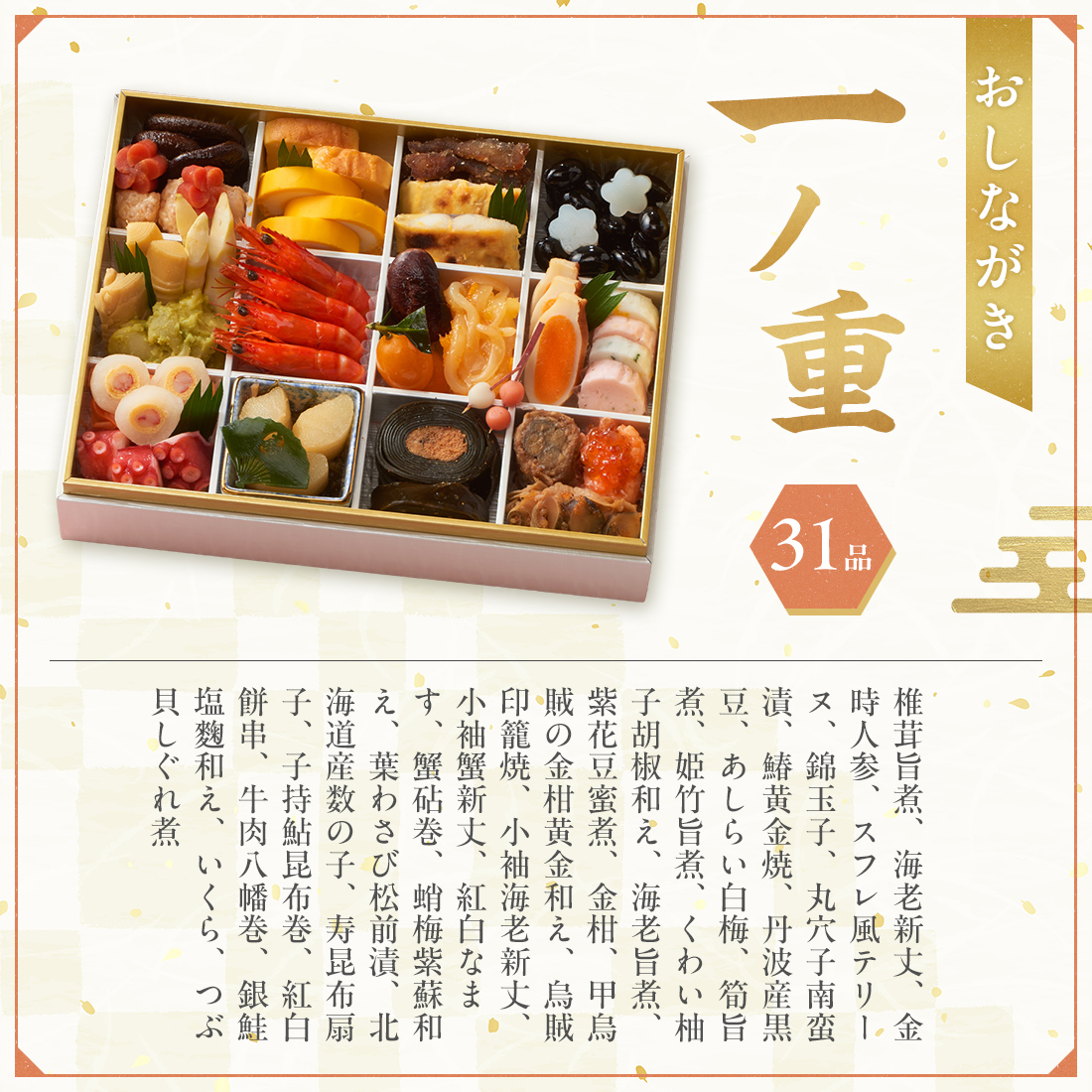椎茸旨煮、海老新丈、金時人参、スフレ風テリーヌ、錦玉子、丸穴子南蛮漬、鰆黄金焼、丹波産黒豆、あしらい白梅、筍旨煮、姫竹旨煮、くわい柚子胡椒和え、海老旨煮、紫花豆蜜煮、金柑、甲烏賊の金柑黄金和え、烏賊印籠焼、小袖海老新丈、小袖蟹新丈、紅白なます、蟹砧巻、蛸梅紫蘇和え、葉わさび松前漬、北海道産数の子、寿昆布扇子、子持鮎昆布巻、紅白餅串、牛肉八幡巻、銀鮭塩麹和え、いくら、つぶ貝しぐれ煮