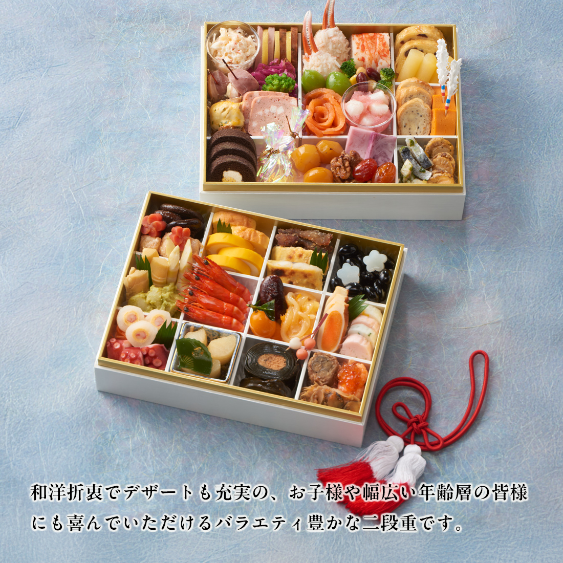 和洋折衷でデザートも充実の、お子様や幅広い年齢層の皆様にも喜んでいただけるバラエティ豊かな二段重です。