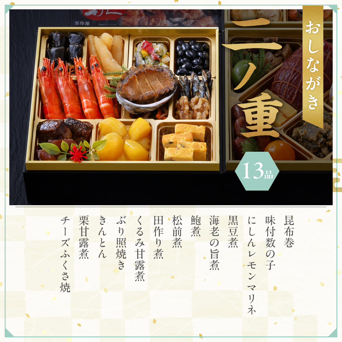 昆布巻4個、味付数の子4本、にしんレモンマリネ40g、黒豆煮40g、海老の旨煮4尾、鮑煮1個、松前煮35g