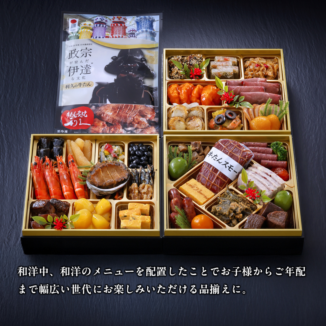 おせちのお重には自社牛たん等の加工品を盛り込んでおります。更に別添品として、牛たん真空パックが1パックが付いおり、牛たんの魅力を前面に押し出したおせちに仕上げました。その他にもお客様からのご要望にお応えし、和洋中、和洋のメニューを配置したことでお子様からご年配まで幅広い世代にお楽しみいただける品揃えに。