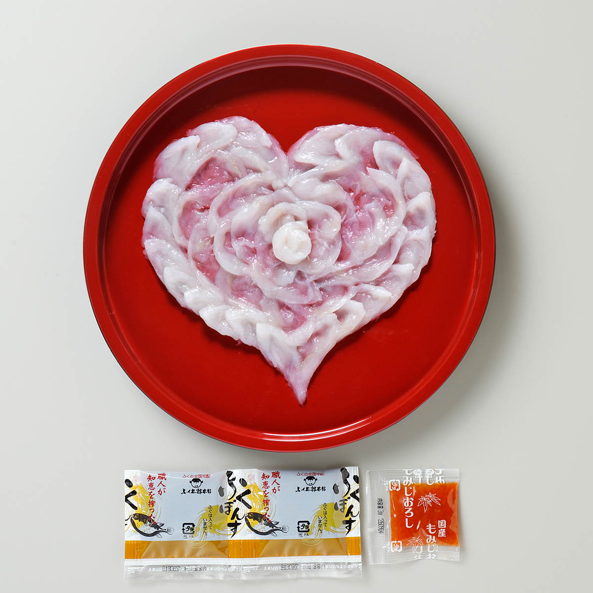 熟練の職人が丁寧にハートの形に盛付けた天然まふくの刺身です。ふくの奥深く豊かな味わいがハートの中に感じられる贈り物に最適なひと品です。