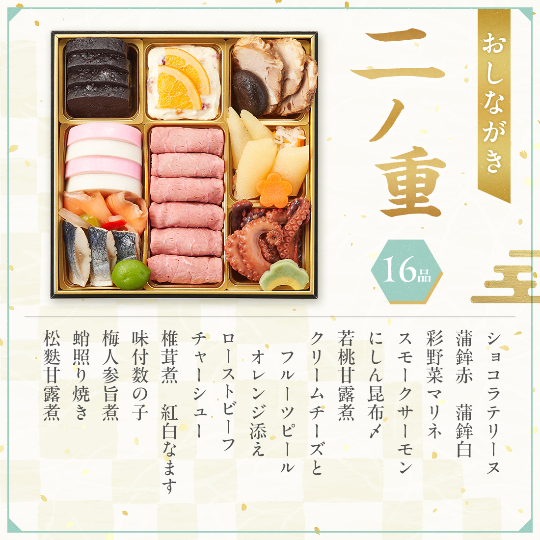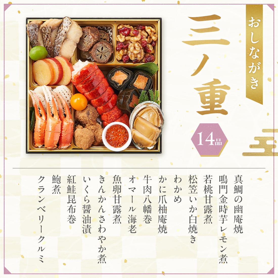 真鯛の幽庵焼 3枚、鳴門金時芋レモン煮 3個、若桃甘露煮 1粒、松笠いか白焼き 3切、わかめ 25g、かに爪柚庵焼 3個、牛肉八幡巻 3切、オマール海老 1尾、魚卵甘露煮 3個、きんかんさわやか煮 1個、いくら醤油漬 10g、紅鮭昆布巻 3個、鮑煮 1個、クランベリークルミ 40g