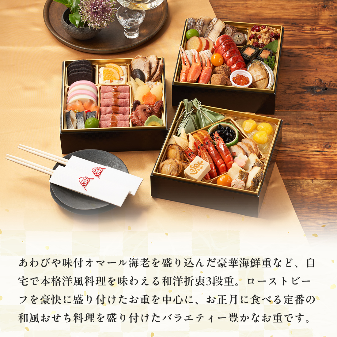 あわびや味付オマール海老を盛り込んだ豪華海鮮重など、自宅で本格洋風料理を味わえる和洋折衷3段重。ローストビーフを豪快に盛り付けたお重を中心に、お正月に食べる定番の和風おせち料理を盛り付けたバラエティー豊かなお重です。