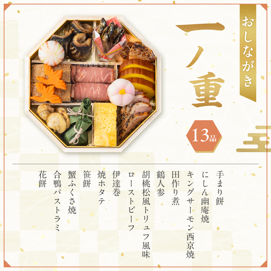 手まり餅1個、にしん幽庵焼3個、キングサーモン西京焼3切、田作り煮10g、鶴人参2個、胡桃松風トリュフ風味6枚、ローストビーフ4枚、伊達巻3枚、焼ホタテ3個、笹餅2個、蟹ふくさ焼6切、合鴨パストラミ4枚、花餅1個