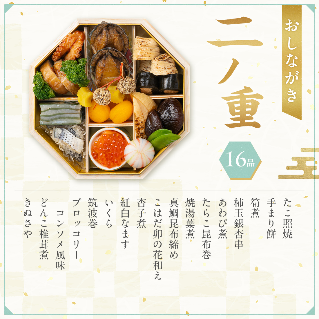 たこ照焼2個、手まり餅1個、筍煮3本、柿玉銀杏串2本、あわび煮 2個、たらこ昆布巻2個、焼湯葉煮3個、真鯛昆布締め3切、こはだ卯の花和え5枚、杏子煮2粒、紅白なます25g、いくら12g、筑波巻2切、ブロッコリーコンソメ風味2個、どんこ椎茸煮4枚、きぬさや2枚