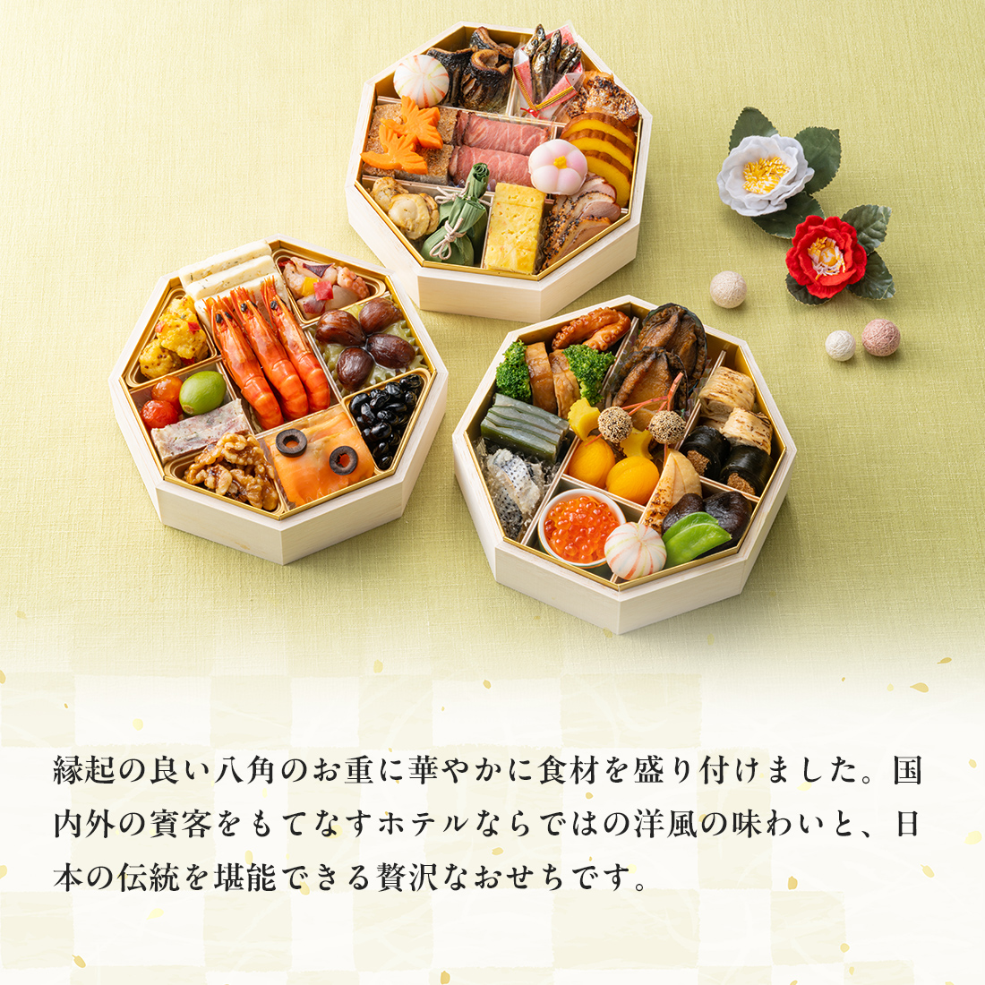縁起の良い八角のお重に華やかに食材を盛り付けました。国内外の賓客をもてなすホテルならではの洋風の味わいと、日本の伝統を堪能できる贅沢なおせちです。