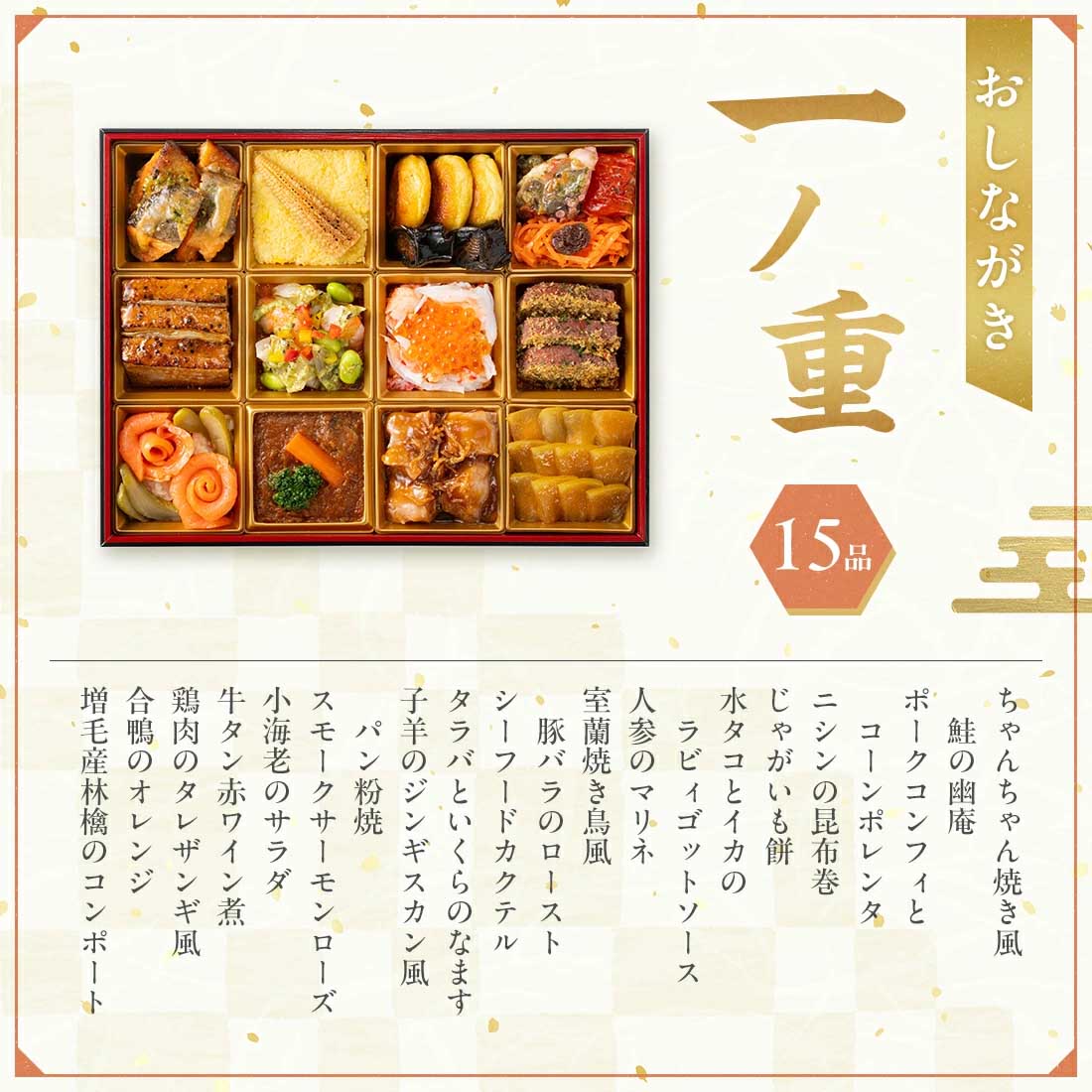 ちゃんちゃん焼き風鮭の幽庵、ポークコンフィとコーンポレンタ、ニシンの昆布巻、じゃがいも餅、水タコとイカのラビィゴットソース、人参のマリネ、室蘭焼き鳥風豚バラのロースト、シーフードカクテル、タラバといくらのなます、子羊のジンギスカン風パン粉焼、スモークサーモンローズ、小海老のサラダ、牛タン赤ワイン煮、鶏肉のタレザンギ風、合鴨のオレンジ、増毛産林檎のコンポート