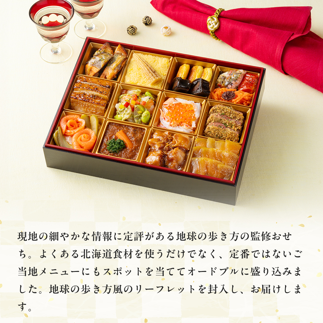 現地の細やかな情報に定評がある地球の歩き方の監修おせち。よくある北海道食材を使うだけでなく、定番ではないご当地メニューにもスポットを当ててオードブルに盛り込みました。地球の歩き方風のリーフレットを封入し、お届けします。
